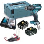 PARAFUSADEIRA E FURADEIRA DE IMPACTO DHP485RF1J COM MALETA E 02 BATERIAS COM 3,0AH + KIT 37 PEÇAS Esta chegou para abalar as parafusadeiras concorrentes. Trata-se da DHP485, uma parafusadeira/furadeira com motor Brushless, 18V e 50N.m de torque em Junta rígida. A DHP485 possui maleta, carregador e bateria, e ela não pode faltar no seu rol de ferramentas. Com ela, o seu trabalho ficará ainda mais divertido e perfeito. Com a tecnologia LXT, é possível utilizar a mesma bateria 18V em várias ferramentas 18V. Diferenciais da ferramenta: Maior autonomia da bateria com motor BL. Resistente à água e poeira com a tecnologia XPT. Mandril de aperto rápido. 2 velocidades mecânicas. 21 níveis de torque. Seletor de função. Iluminação de trabalho. Punho emborrachado. Rotação reversível. Velocidades variável. Freio instantâneo. Dados técnicos: Capacidades - Aço: 13mm; - Madeira: 38m; - Concreto: 13mm; Capacidade do mandril: 1,5 - 13mm; Impactos por minuto: - Alta: 0 - 28.500; - Baixa: 0 - 7.500; Rotações por minuto: - Alta: 0 - 1.900; - Baixa: 0 – 500; Torque: - Junta rígida: 50N.m; - Junta flexível: 27N.m; Dimensões(C x L x A): 182 x 79 x 255mm; Peso: 1,8Kg; Bateria: 18V. Itens que acompanham a máquina: -02 baterias 18V 3,0 Ah; -01 carregador rápido Bivolt; -01 Maleta e Mak-pac; -01 Conjunto de Bits 18 peças MTX.