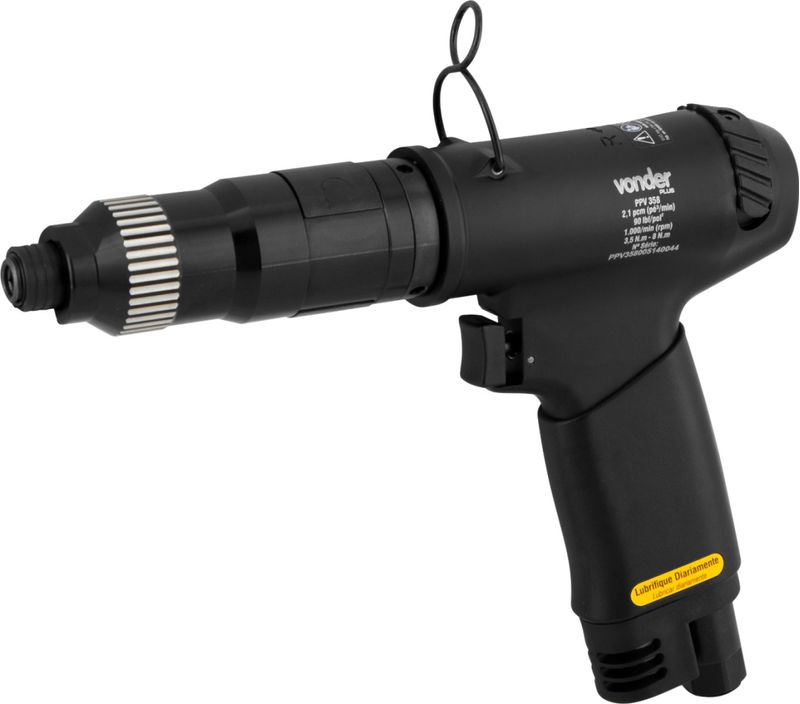 Marca: VonderConteúdo da embalagem:1 Parafusadeira. Acompanha: 1 gancho para balancim e 1 chave para ajuste do torque.Destaques e diferenciais:Possui ajuste de torque, fácil acesso a mudança no sistema de reversão e silenciador. Conta com sistema de troca rápida dos bits e desligamento automático (Shut-off), garantindo maior segurança e agilidade na operação. Conta com acionamento por gatilho. Ergonômica, proporciona conforto e praticidade ao operador.Aplicações e dicas de uso:Indicada para diversas operações de aperto e desaperto de parafusos e porcas em geral. Uso industrial. Mantenha a ferramenta constantemente lubrificada e utilize sempre o regulador de pressão e o lubrificador de linha com óleo pneumático. .Detalhes TécnicosModelo: PPV358 Consumo de ar: 2,1 pcm (pé³/min) Pressão de trabalho: 90 lbf/pol² Tipo do encaixe da parafusadeira: Sextavado - 1/4" - 6,35 mm Tipo de acionamento: Acionamento por gatilho Sistema de reversão: Sim Rotações por minuto (rpm): 1.000/min Torque: 3,5 N.m - 8,0 N.m Rosca de entrada de ar: 1/4" NPT fêmea Diâmetro da mangueira: 3/8" Aceleração transmitida nas mãos - braços do operador - ah: 0,61 m/s² Incerteza da aceleração transmitida nas mãos - braços do operador - k: 0,56 m/s² Massa aproximada (peso) (kg): 1,236 kg Garantia - E (CDC):Garantia legal: 90 dias + Garantia contratual: 3 meses (Para locadoras, garantia única e exclusiva de 90 dias)