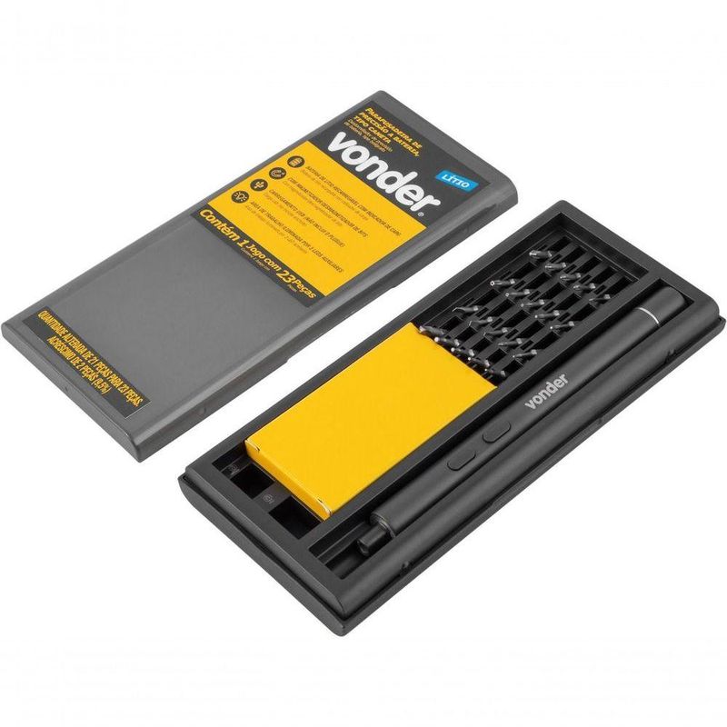 Parafusadeira Precisão Bateria 3,7v Tipo Caneta VonderMarca: VonderConteúdo da embalagem:1 Parafusadeira de precisão a bateria. Acompanha: 1 estojo com magnetizador/desmagnetizador, 1 cabo para carregamento (USB), 2 bits estrela (P, 2 P5), 1 bits triângulo (?3.0), 2 bits Allen (1,5 mm, 2 mm), 5 bits Phillips (PH0000, PH000, PH00, PH0 e PH1), 3 bits fenda (1,5 mm, 2 mm e 2,5 mm), 3 bits hexalobular (T2, T3 e T4), 3 bits hexalobular com furo (T5, T6 e T8) e 1 bits Y (Y0,6).Destaques e diferenciais:Possui 3 LEDs auxiliares, para melhor iluminação na área de trabalho, e bateria de lítio recarregável com indicador de carregamento. Conta com bits em material S2, proporcionando maior durabilidade e resistência. E ainda, possui proteção contra sobrecarga.Aplicações e dicas de uso:Indicada para fixar e soltar parafusos. Ideal para trabalhos que necessitam de qualidade e precisão, como para uso em placas eletrônicas, computadores, monitores, smartphones, câmeras fotográficas, pequenos objetos, entre outros. Possui magnetizador/desmagnetizador embutido no estojo. Carregamento via cabo USB (não acompanha o plugue).Detalhes TécnicosModelo: Tipo Caneta Tensão da bateria (V): 3,7 V Tipo de bateria: Lítio Tensão do carregador de bateria: Carregamento via cabo USB (não acompanha plugue) Frequência (Hz): 50 Hz/60 Hz Tipo de mandril: Enc. sextavado - 1/4 - 6,35 mm Capacidade do mandril: 5/32 - 4mm Sistema de reversão: Sim Tipo de velocidade: Fixa Rotação da furadeira/parafusadeira: 200/min Luz de LED: Sim Segue norma: ABNT NBR IEC 60745-1 e ABNT NBR IEC 60745-2-2 Massa aproximada.: 40 gGarantia - E (CDC):Garantia legal: 90 dias + Garantia contratual: 9 meses (Para locadoras, garantia única e exclusiva de 90 dias) NA