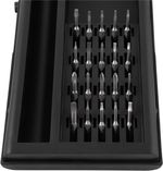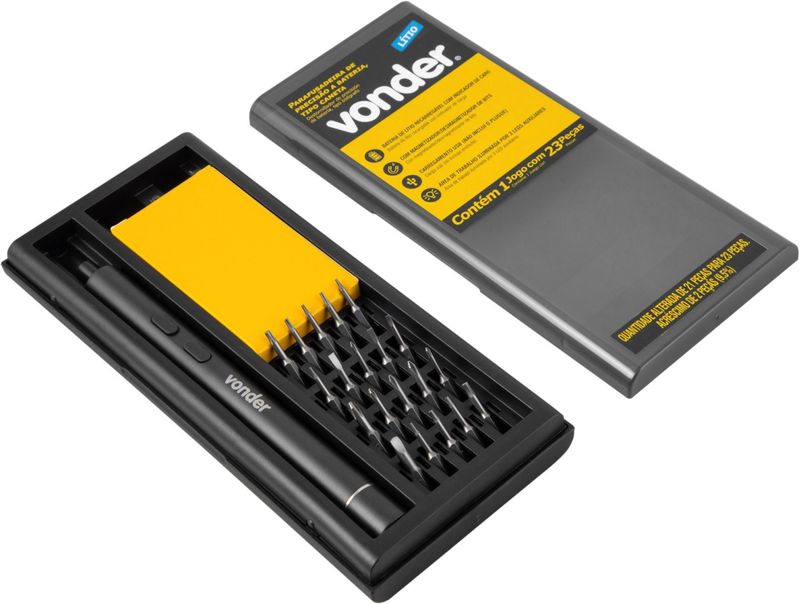 Marca: VonderConteúdo da embalagem:1 Parafusadeira de precisão a bateria. Acompanha: 1 estojo com magnetizador/desmagnetizador, 1 cabo para carregamento (USB), 2 bits estrela (P, 2 P5), 1 bits triângulo (∆3.0), 2 bits Allen (1,5 mm, 2 mm), 5 bits Phillips (PH0000, PH000, PH00, PH0 e PH1), 3 bits fenda (1,5 mm, 2 mm e 2,5 mm), 3 bits hexalobular (T2, T3 e T4), 3 bits hexalobular com furo (T5, T6 e T8) e 1 bits Y (Y0,6).Destaques e diferenciais:Possui 3 LEDs auxiliares, para melhor iluminação na área de trabalho, e bateria de lítio recarregável com indicador de carregamento. Conta com bits em material S2, proporcionando maior durabilidade e resistência. E ainda, possui proteção contra sobrecarga.Aplicações e dicas de uso:Indicada para fixar e soltar parafusos. Ideal para trabalhos que necessitam de qualidade e precisão, como para uso em placas eletrônicas, computadores, monitores, smartphones, câmeras fotográficas, pequenos objetos, entre outros. Possui magnetizador/desmagnetizador embutido no estojo. Carregamento via cabo USB (não acompanha o plugue).Detalhes TécnicosModelo: Tipo Caneta Tensão da bateria (V): 3,7 V Tipo de bateria: Lítio Tensão do carregador de bateria: Carregamento via cabo USB (não acompanha plugue) Frequência (Hz): 50 Hz/60 Hz Tipo de mandril: Enc. sextavado - 1/4" - 6,35 mm Capacidade do mandril: 5/32" - 4mm Sistema de reversão: Sim Tipo de velocidade: Fixa Rotação da furadeira/parafusadeira: 200/min Luz de LED: Sim Segue norma: ABNT NBR IEC 60745-1 e ABNT NBR IEC 60745-2-2 Massa aproximada.: 40 g Garantia - E (CDC):Garantia legal: 90 dias + Garantia contratual: 9 meses (Para locadoras, garantia única e exclusiva de 90 dias)