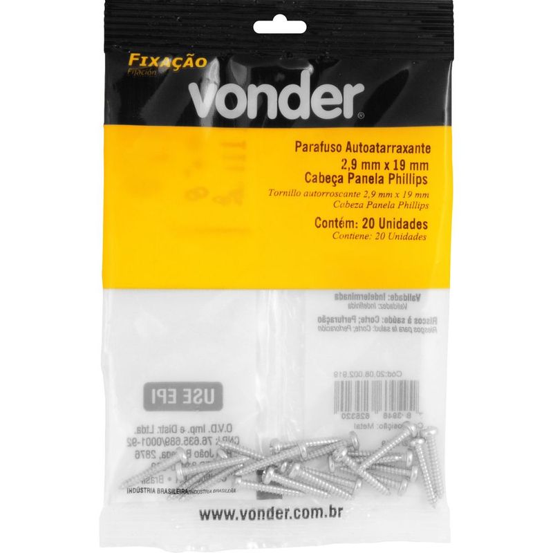 Marca: VonderConteúdo da Embalagem:1 Cartela com 20 parafusosDestaques e diferenciais:Possui acabamento zincado que aumenta a resistência contra corrosão/oxidação, além de cabeça tipo phillips, que proporciona maior força de aperto e menor possibilidade da chave ou bits escapar e riscar a peça que está sendo trabalhada.Aplicações e dicas de uso:Indicado para fixações de acessórios e objetos em paredes de alvenaria e concreto com buchas de fixação. Permite fixações em móveis tubulares, equipamentos fabricados com chapas metálicas finas e esquadrias de alumínio. Muito utilizado na fabricação de móveis em madeira e MDF.Características Técnicas:Material do parafuso autoatarraxante: Aço carbono Acabamento do parafuso autoatarraxante: Zincado Diâmetro da rosca do parafuso autoatarraxante: 2,9 mm Comprimento do parafuso autoatarraxante: 19,0 mm Tipo da cabeça do parafuso autoatarraxante: Panela Tipo da fenda do parafuso autoatarraxante: Phillips (fenda cruzada)