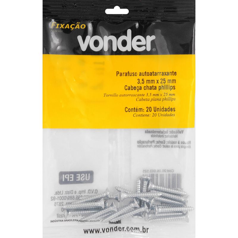 Marca: VonderConteúdo da Embalagem:1 Cartela com 20 parafusosDestaques e diferenciais:Possui acabamento zincado que aumenta a resistência contra corrosão/oxidação. Conta com cabeça chata/cônica que oferece acabamento rente à superfície.Aplicações e dicas de uso:Indicado para fixações de acessórios e objetos em paredes de alvenaria e concreto com buchas de fixação. Permite fixações em móveis tubulares, equipamentos fabricados com chapas metálicas finas e esquadrias de alumínio. Muito utilizado na fabricação de móveis em madeira e MDF.Características Técnicas:Material do parafuso autoatarraxante: Aço carbono Acabamento do parafuso autoatarraxante: Zincado Diâmetro da rosca do parafuso autoatarraxante: 3,5 mm Comprimento do parafuso autoatarraxante: 25,0 mm Tipo da cabeça do parafuso autoatarraxante: Chata Tipo da fenda do parafuso autoatarraxante: Phillips (fenda cruzada)