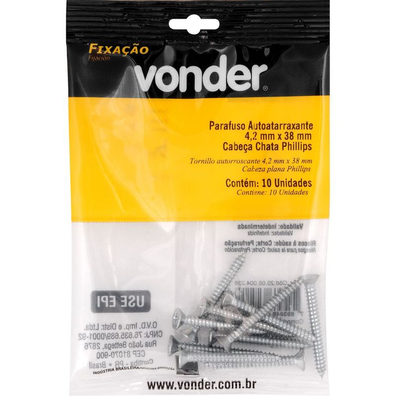 Marca: VonderConteúdo da Embalagem:1 Cartela com 10 parafusosDestaques e diferenciais:Possui acabamento zincado que aumenta a resistência contra corrosão/oxidação. Conta com cabeça chata/cônica que oferece acabamento rente à superfície.Aplicações e dicas de uso:Indicado para fixações de acessórios e objetos em paredes de alvenaria e concreto com buchas de fixação. Permite fixações em móveis tubulares, equipamentos fabricados com chapas metálicas finas e esquadrias de alumínio. Muito utilizado na fabricação de móveis em madeira e MDF.Características Técnicas:Material do parafuso autoatarraxante: Aço carbono Acabamento do parafuso autoatarraxante: Zincado Diâmetro da rosca do parafuso autoatarraxante: 4,2 mm Comprimento do parafuso autoatarraxante: 38,0 mm Tipo da cabeça do parafuso autoatarraxante: Chata Tipo da fenda do parafuso autoatarraxante: Phillips (fenda cruzada)