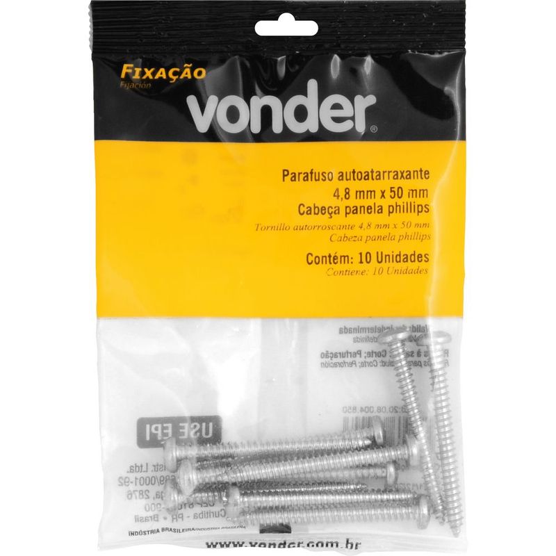 Marca: VonderConteúdo da Embalagem:1 Cartela com 10 parafusosDestaques e diferenciais:Possui acabamento zincado que aumenta a resistência contra corrosão/oxidação, além de cabeça tipo phillips, que proporciona maior força de aperto e menor possibilidade da chave ou bits escapar e riscar a peça que está sendo trabalhada.Aplicações e dicas de uso:Indicado para fixações de acessórios e objetos em paredes de alvenaria e concreto com buchas de fixação. Permite fixações em móveis tubulares, equipamentos fabricados com chapas metálicas finas e esquadrias de alumínio. Muito utilizado na fabricação de móveis em madeira e MDF.Características Técnicas:Material do parafuso autoatarraxante: Aço carbono Acabamento do parafuso autoatarraxante: Zincado Diâmetro da rosca do parafuso autoatarraxante: 4,8 mm Comprimento do parafuso autoatarraxante: 50,0 mm Tipo da cabeça do parafuso autoatarraxante: Panela Tipo da fenda do parafuso autoatarraxante: Phillips (fenda cruzada)