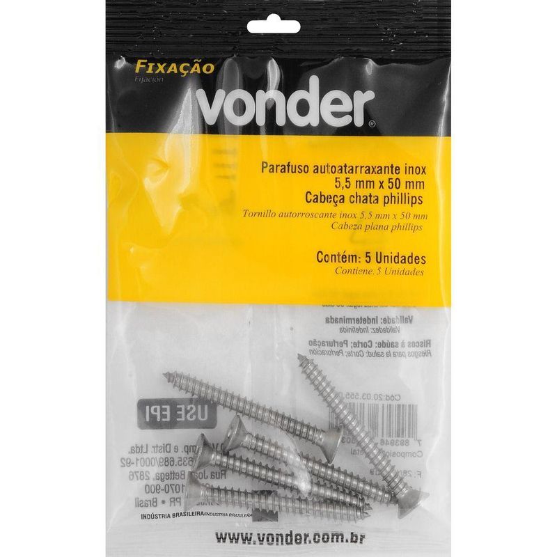 Parafuso Autoatarraxante Inox 5,5x50,0mm Phillips VonderMarca: VonderConteúdo da Embalagem:1 Cartela com 5 parafusosDestaques e diferenciais:Fabricado em aço inox, proporcionando excelente resistência contra corrosão/oxidação. Conta com cabeça chata/cônica que oferece acabamento rente à superfície.Aplicações e dicas de uso:Indicado para fixações de acessórios e objetos em paredes de alvenaria e concreto com buchas de fixação. Permite fixações em móveis tubulares, equipamentos fabricados com chapas metálicas finas e esquadrias de alumínio. Muito utilizado na fabricação de móveis em madeira e MDF.Características Técnicas:Material do parafuso autoatarraxante: Inox Acabamento do parafuso autoatarraxante: N/A Diâmetro da rosca do parafuso autoatarraxante: 5,5 mm Comprimento do parafuso autoatarraxante: 50,0 mm Tipo da cabeça do parafuso autoatarraxante: Chata Tipo da fenda do parafuso autoatarraxante: Phillips (fenda cruzada) Produto: Parafuso | Tipo de Parafuso: Autoatarraxante