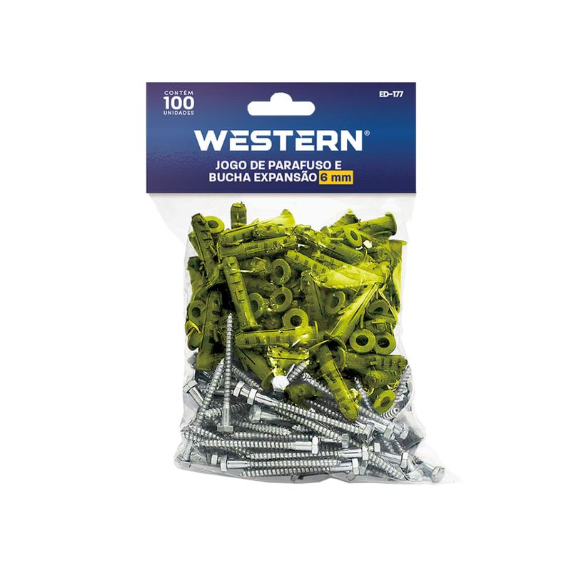 Parafuso e Bucha de Expansão 6mm Western - Pacote com 100 PeçasO Parafuso e Bucha de Expansão 6mm da WESTERN é a solução ideal para fixações seguras e duradouras em seus projetos. Este conjunto foi desenvolvido para oferecer praticidade e eficiência.Com um pacote contendo 100 peças, você terá um suprimento adequado para diversas aplicações, desde pequenos reparos domésticos até projetos maiores. A qualidade WESTERN garante a confiabilidade necessária para suas instalações.Diferenciais do ProdutoFixação Segura: Projetado para proporcionar uma ancoragem firme e estável, garantindo que seus projetos permaneçam seguros e confiáveis.Praticidade: Conjunto completo de parafuso e bucha, pronto para uso, economizando tempo e esforço na busca por componentes separados.Quantidade Ideal: Pacote com 100 unidades, oferecendo excelente custo-benefício e conveniência para projetos de diversos tamanhos.Mais sobre o ProdutoVersatilidade: Adequado para uso em concreto, alvenaria e outros materiais de construção.Durabilidade: Fabricado com materiais de alta qualidade para resistir ao desgaste e garantir uma longa vida útil.Fácil Instalação: Design intuitivo que permite uma instalação rápida e sem complicações.Detalhes AdicionaisMateriais de Fabricação: Aço carbono (parafuso) e nylon (bucha).Cor: Cinza (bucha).Uso Recomendado: Fixação de prateleiras, quadros, luminárias e outros objetos em paredes.Instruções de Uso e CuidadosDicas de Uso: Utilize uma furadeira com broca de diâmetro adequado para o tamanho da bucha. Insira a bucha no furo e, em seguida, aparafuse o parafuso até que esteja firme.Recomendações de Limpeza/Manutenção: Limpe a área ao redor da fixação com um pano seco para remover poeira e sujeira.Ficha TécnicaMarca: WESTERNNome: PARAFUSO BUCHA EXP 6MM 100PCEAN: 7897186077215Código de Referencia: ED-177Tamanho: 6MMQuantidade por pacote: 100 Peças