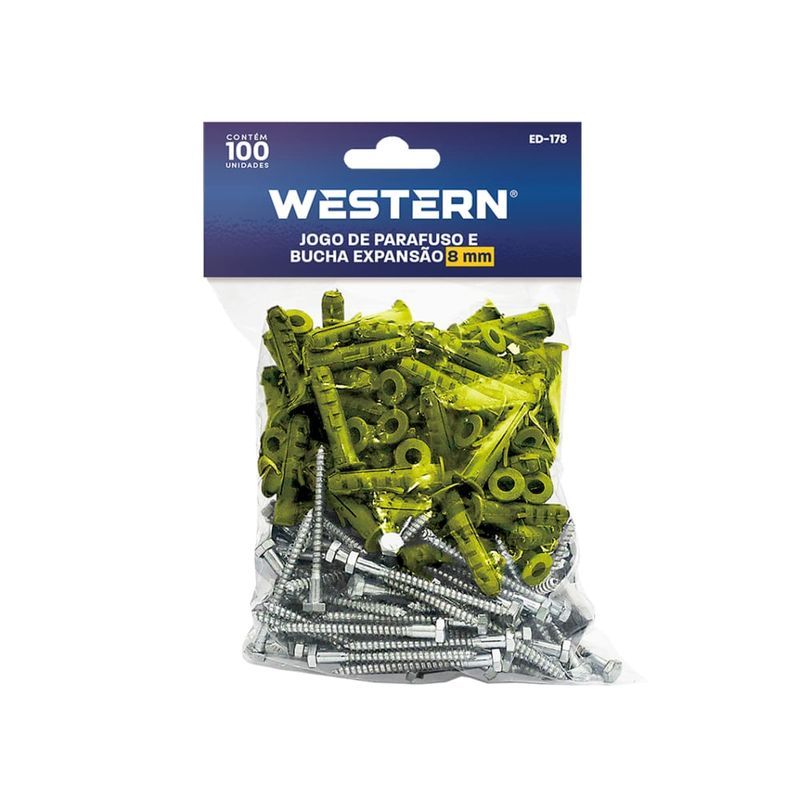 Parafuso Bucha Expansão 8mm Western - Pacote com 100 PeçasGaranta uma fixação confiável e duradoura com o Parafuso Bucha Expansão 8mm Western. Ideal para diversas aplicações, este conjunto oferece a praticidade e a segurança que seus projetos exigem.O Parafuso Bucha Expansão 8mm Western é a solução perfeita para profissionais e entusiastas que buscam qualidade em fixações. Com buchas de expansão de 8mm, este kit é adequado para uso em diferentes superfícies, proporcionando um suporte robusto para objetos e estruturas. A marca Western é sinônimo de confiabilidade e desempenho.CaracterísticasFixação Segura: Projetado para oferecer uma ancoragem firme e estável.BenefíciosPacote Econômico: Contém 100 peças, ideal para projetos de médio e grande porte.Qualidade Western: Marca reconhecida pela durabilidade e desempenho de seus produtos.Mais sobre o Parafuso Bucha ExpansãoVersatilidade: Adequado para diversas aplicações em construção civil e reparos domésticos.Praticidade: Fácil de instalar, otimizando o tempo de trabalho.Instruções de UsoAplicação: Utilize broca com diâmetro adequado para o tamanho da bucha.Instalação: Insira a bucha no furo e, em seguida, aparafuse o parafuso até a fixação completa.Recomendações de Limpeza/ManutençãoLimpeza: Utilize um pano seco para remover o excesso de poeira ou sujeira.Manutenção: Verifique periodicamente a fixação para garantir a segurança.Ficha TécnicaMarca: WESTERNTipo: Parafuso com Bucha de ExpansãoTamanho da Bucha: 8mmQuantidade por Pacote: 100 PeçasMaterial: Plástico, AçoCódigo de Referência: ED-178EAN: 7897186077222