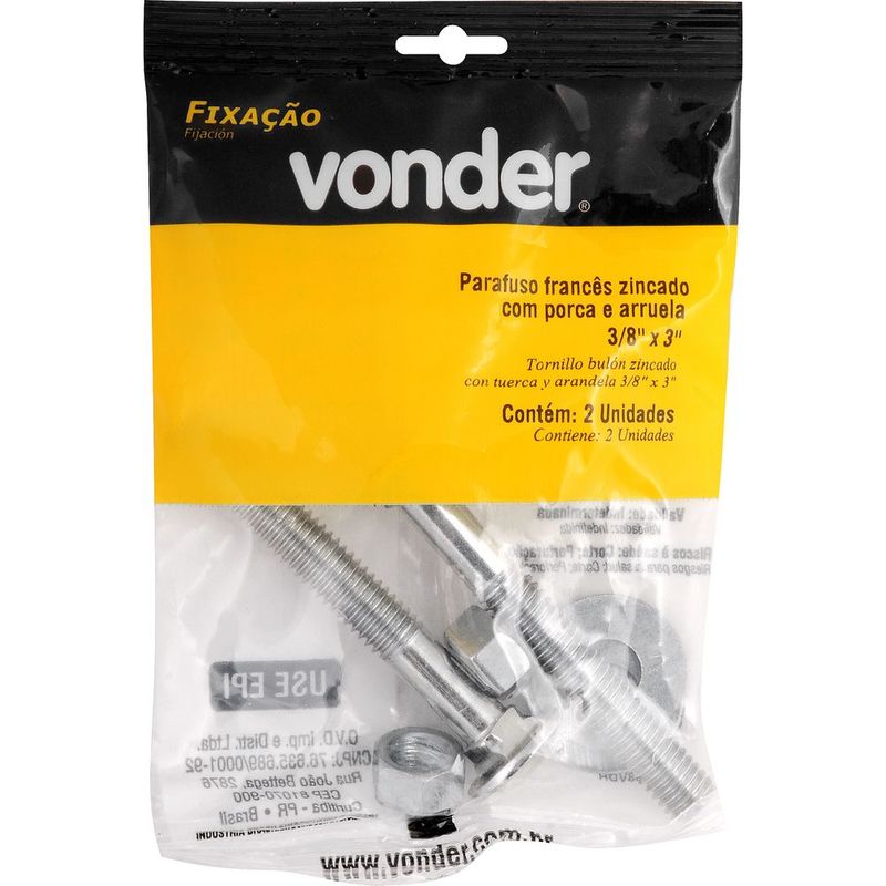 Marca:VonderConteúdo da Embalagem:1 Cartela com 2 parafusos, 2 porcas e 2 arruelasAplicações e dicas de uso:Indicado para fixações em geral. Ideal para uso em atividades na construção naval, fixação de corrimão de escadas, produção de embalagens, paletes, suportes para eletrodomésticos, escadas de madeira, ferragens agrícolas, placas de sinalização, bancos para jardins, pontes, portões, cercas de madeira, vigamentos de casas e galpões, carrocerias de caminhões, carretas, abraçadeiras para eletroferragens e irrigação, quadras esportivas, e também na construção de trilhadeiras, arados de tração animal e mecânica, carroças, bretes para trabalhar com gado, carretas para trator, entre outros.Destaques e diferenciais:Acompanha porca e arruela e possui acabamento zincado, proporcionando maior resistência contra à oxidação/corrosão.Características Técnicas:Material do parafuso francês: Aço carbono Acabamento do parafuso francês: Zincado Diâmetro da rosca do parafuso francês: 0.3/8 " Comprimento do parafuso francês: 3.0/0 " Comprimento da rosca do parafuso francês: Parcial Tipo da rosca do parafuso francês: UNC - Polegada rosca grossa Número de fios por polegada: 16 Norma ANSI: B-18.5 Garantia - E (CDC): Garantia legal: 90 dias