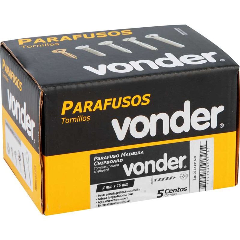 Parafuso Madeira 4,0 x 16 mm Chipboard Cabeça Flangeada Phillips 500 Peças VonderFabricado em aço carbono de alta resistência e com tratamento bicromatizado (zincado amarelo), esse parafuso não só oferece excelente performance mecânica como também proporciona proteção contra corrosão, aumentando sua vida útil mesmo em ambientes com umidade moderada, como cozinhas e áreas de serviço.Com diâmetro de 4,0 mm e comprimento de apenas 16 mm, é especialmente indicado para fixações em materiais mais finos ou delicados, como MDF, aglomerado, compensado e pínus. Ideal para montagem de partes internas de móveis, painéis, fundos de gavetas e encaixes rápidos, onde uma fixação curta, mas robusta, faz toda a diferença.A cabeça flangeada amplia a área de apoio na superfície da madeira, evitando afundamentos e rachaduras durante o aperto. Já a fenda cruzada do tipo Phillips oferece encaixe preciso para chaves e bits, reduzindo o risco de deslizamento e danos à peça. Isso se traduz em um trabalho mais limpo, seguro e eficiente, mesmo com ferramentas elétricas de alta rotação.Especificações- Qualificação Técnica- Diâmetro: 4,0 mm- Comprimento (mm): 16 mm- Tipo de fenda: Fenda cruzada/phillips- Cabeça: Flangeada- Material (tipo/composição): Aço carbono- Tratamento: Bicromatizado (zincado amarelo)- Massa aproximada (peso) (kg): 0,094 kgItens inclusos- 500 Parafusos Madeira 4,0X16 ChipB Cabeça FL Ph VonderGarantia- 03 meses com o fabricante
