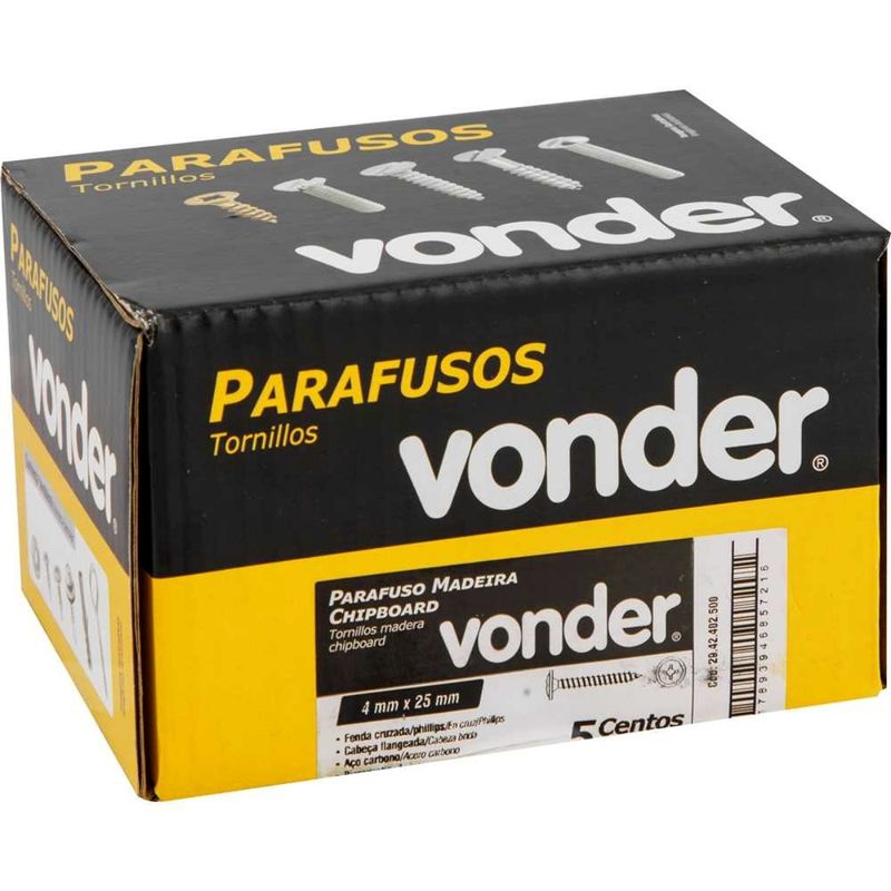 Parafuso Madeira 4,0 x 25 mm Chipboard Cabeça Flangeada Phillips 500 Peças VonderProduzido em aço carbono de alta resistência, este parafuso oferece excelente desempenho mecânico em diversos tipos de madeira, como aglomerado, MDF, compensado e pínus. Seu diâmetro de 4,0 mm e comprimento de 25 mm tornam-no perfeito para montagens rápidas, estruturas leves, fixação de dobradiças, placas e acessórios de madeira, garantindo firmeza sem trincar ou danificar o material.A cabeça flangeada é um grande diferencial. Esse formato aumenta a área de contato na superfície, melhorando a distribuição da pressão e evitando afundamento ou lascamento na madeira. Com isso, você obtém acabamento mais profissional e seguro, sem a necessidade de arruelas.Outro destaque é a fenda cruzada do tipo Phillips, que facilita a aplicação com parafusadeiras e chaves manuais. Esse padrão reduz o risco de escape da ferramenta durante o aperto, proporcionando mais controle e evitando danos à peça fixada.Além disso, o parafuso recebe tratamento bicromatizado (zincado amarelo), que protege contra corrosão e oxidação. Esse acabamento confere durabilidade ao produto mesmo em ambientes com umidade, como cozinhas, áreas externas cobertas ou móveis próximos a áreas úmidas.Especificações- Qualificação Técnica- Diâmetro: 4,0 mm- Comprimento (mm): 25 mm- Tipo de fenda: Fenda cruzada/phillips- Cabeça: Flangeada- Material (tipo/composição): Aço carbono- Tratamento: Bicromatizado (zincado amarelo)- Massa aproximada (peso) (kg): 0,145 kgItens inclusos- 500 Parafusos Madeira 4,0X25 ChipB Cabeça FL Ph 500 PeçasGarantia- 03 meses com o fabricante