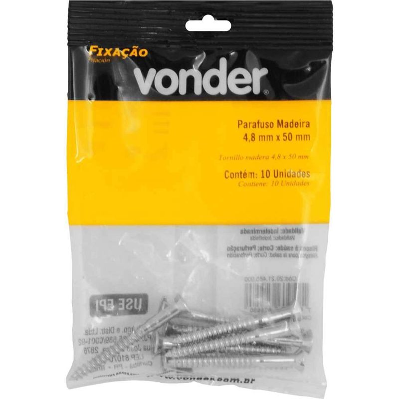 Parafuso Madeira 4,8 mm x 50 mm, Cabeça Chata, Zincado, Vonder OstenVonder - Conteúdo da embalagem: 1 Cartela com 10 parafusos madeira. Aplicação: Indicado para fixações em madeiras e derivados. Pode ser utilizado também em alvenaria com o auxÃlio de uma bucha. Destaques: Produzido em aço carbono. Possui acabamento zincado, proporcionando maior resistência contra oxidação/corrosão. Conta com cabeça chata/cônica que oferece acabamento rente à superfÃcie. Referência: 2021485000 Garantia - E (CDC): Garantia legal: 90 dias Diâmetro: 4,8 mm Comprimento: 50,0 mm Cabeça: Chata Tipo de fenda: Simples Acabamento: Zincado Material: Aço carbono Massa aproximada (peso): 0.2 kg Destaques Comercial: Aço carbono zincado, resistente à corrosão, com cabeça chata/cônica para acabamento rente. Aplicação Comercial: Fixações em madeira e derivados; uso em alvenaria com bucha. Características Gerais do Produto: Garantia: • 3 Meses