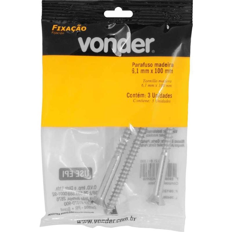 Parafuso Madeira 6,1 mm x 100 mm, Cabeça Chata, Zincado, Vonder OstenVonder - Conteúdo da embalagem: 1 Cartela com 3 parafusos madeira. Aplicação: Indicado para fixações em madeiras e derivados. Pode ser utilizado também em alvenaria com o auxÃlio de uma bucha. Destaques: Produzido em aço carbono. Possui acabamento zincado, proporcionando maior resistência contra oxidação/corrosão. Conta com cabeça chata/cônica que oferece acabamento rente à superfÃcie. Referência: 2021611000 Garantia - E (CDC): Garantia legal: 90 dias Diâmetro: 6,1 mm Comprimento: 100,0 mm Cabeça: Chata Tipo de fenda: Simples Acabamento: Zincado Material: Aço carbono Massa aproximada (peso): 0.2 kg Destaques Comercial: Aço carbono zincado, resistente à corrosão, com cabeça chata/cônica para acabamento rente. Aplicação Comercial: Para fixações em madeira e derivados ou em alvenaria com bucha. Características Gerais do Produto: Garantia: • 3 Meses