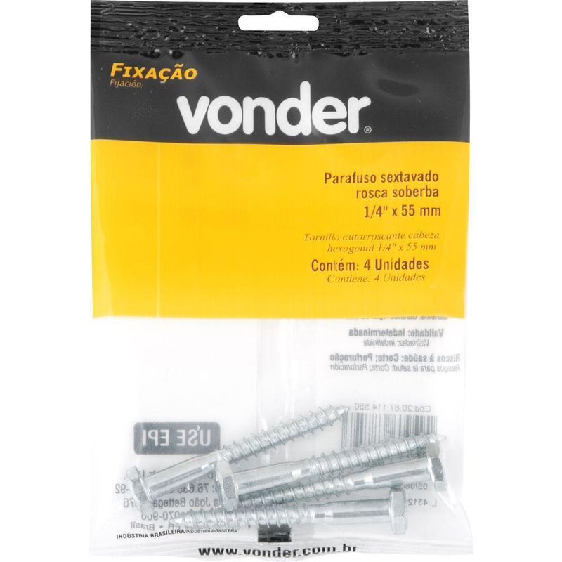 Parafuso Sextavado Rosca Soberba 1/4''x55mm 4 Peças VonderMarca: VonderConteúdo da Embalagem:1 Cartela com 4 parafusos sextavados rosca soberbaDestaques e diferenciais:Possui acabamento zincado, proporcionando maior resistência contra oxidação/corrosãoAplicações e dicas de uso:Indicado para fixações entre duas ou mais partes, como aplicação em madeira, alvenaria e concreto (para concreto, necessita utilização de bucha de fixação)Características Técnicas:Diâmetro do parafuso sextavado (pol): 0.1/4 Comprimento do parafuso sextavado (mm): 55,0 mm Produto: Parafuso | Tipo de parafuso: Sextavado