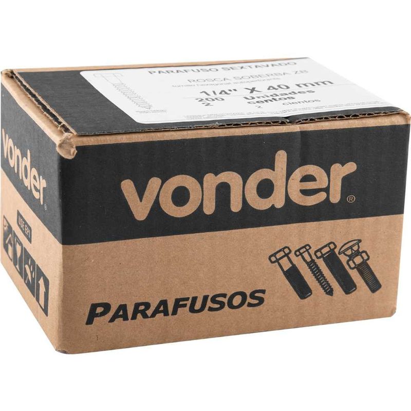 Parafuso Sextavado Rosca Soberba 1/4" x 40 mm, Vonder - Conteúdo da embalagem: Sob consulta. Aplicação: Indicado para fixações entre duas ou mais partes, como aplicação em madeira, alvenaria e concreto (para concreto ou alvenaria, necessita utilização de bucha de fixação). Destaques: Possui acabamento zincado, proporcionando maior resistência contra oxidação/corrosão. Referência: 50720410 Garantia - E (CDC): Garantia legal: 90 dias Massa aproximada (peso): 0.995 kg Acabamento: Zincado Material: Aço baixo teor de carbono Diâmetro: 1/4" Comprimento: 40 mm Chave: 7/16" Comprimento aproximado da rosca: 28,0 mm a 30,0 mm Segue norma: ASME B18.2.1 Destaques Comercial: Possui acabamento zincado, proporcionando maior resistência contra oxidação/corrosão. Aplicação Comercial: Usado para fixar duas ou mais partes em madeira, alvenaria e concreto (com bucha para estes dois últimos). Características Gerais do Produto: Garantia: • 3 Meses