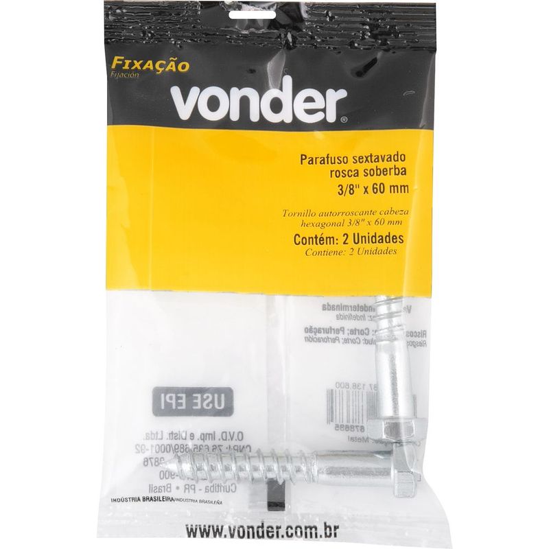 Marca: VonderConteúdo da Embalagem:1 Cartela com 2 parafusos sextavados rosca soberbaDestaques e diferenciais:Possui acabamento zincado, proporcionando maior resistência contra oxidação/corrosãoAplicações e dicas de uso:Indicado para fixações entre duas ou mais partes, como aplicação em madeira, alvenaria e concreto (para concreto, necessita utilização de bucha de fixação)Características Técnicas:Diâmetro do parafuso sextavado (pol): 0.3/8 " Comprimento do parafuso sextavado (mm): 60,0 mm