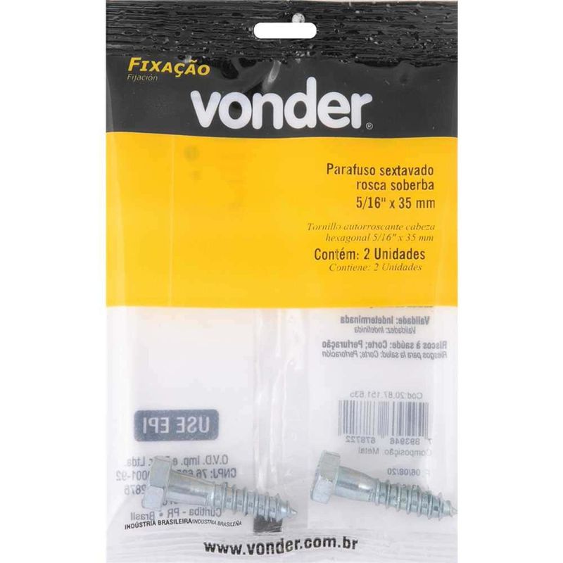 Parafuso Sextavado Rosca Soberba 5/16" x 35 mm, Cartela com 2 Peças, Vonder OstenVonder - Conteúdo da embalagem: 1 Cartela com 2 peças. Aplicação: Indicado para fixações entre duas ou mais partes, como aplicação em madeira, alvenaria e concreto (para concreto ou alvenaria, necessita utilização de bucha de fixação). Destaques: Possui acabamento zincado, proporcionando maior resistência contra oxidação/corrosão. Referência: 2087151635 Garantia - E (CDC): Garantia legal: 90 dias Massa aproximada (peso): 0,03 kg Diâmetro: 5/16" Comprimento: 35 mm Acabamento: Zincado Material: Aço baixo teor de carbono Chave: 1/2" Comprimento aproximado da rosca: 22,0 mm a 25,0 mm Segue norma: ASME B18.2.1 Destaques Comercial: Possui acabamento zincado, proporcionando maior resistência contra oxidação/corrosão. Aplicação Comercial: Usado para fixar duas ou mais partes em madeira, alvenaria e concreto, com bucha para estes dois últimos. Características Gerais do Produto: Garantia: • 3 Meses