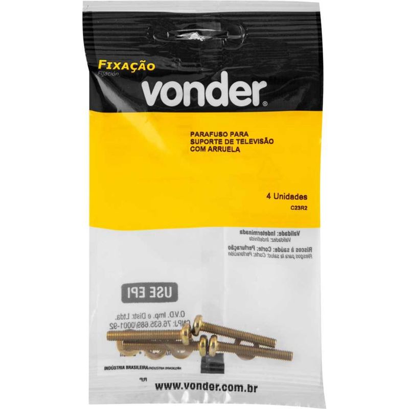 Parafuso Vonder para Suporte de TV 8 x 45 mm com Arruela 5/16 com 4 Peças - Vonder Oficial Para quem busca segurança e durabilidade na hora de instalar televisores em painéis, o Parafuso Vonder para Suporte de TV 8 x 45 mm com Arruela 5/16" – Kit com 4 Peças é a escolha certa. Desenvolvido com aço carbono de alta qualidade e acabamento zincado, este conjunto oferece excelente resistência contra oxidação, garantindo uma fixação firme e duradoura mesmo em ambientes sujeitos à umidade e variações de temperatura. Com diâmetro de 8 mm e comprimento de 45 mm, os parafusos oferecem o equilíbrio ideal entre força e profundidade, assegurando encaixe preciso e suporte confiável para televisores de diversos tamanhos. O kit acompanha ainda arruelas 5/16”, que distribuem uniformemente a pressão aplicada, evitando danos à superfície do painel e proporcionando maior estabilidade ao conjunto. Esse modelo é especialmente indicado para instalação de TVs em painéis de madeira, MDF ou MDP, seja em ambientes residenciais, comerciais ou corporativos. Seu design prático e robusto facilita o processo de montagem, sendo uma solução eficiente tanto para profissionais da marcenaria e montagem de móveis quanto para o consumidor final que busca praticidade e segurança na instalação de suportes para TV. Especificações- Material (tipo/composição): Aço carbono- Acabamento: Zincado- Diâmetro: 8 mm- Comprimento do parafuso: 45 mm- Massa aproximada (peso) (kg): 0,094 kg Itens inclusos- 4 parafusos e 4 arruelas Garantia- 03 meses com o fabricante