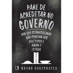 "De João VI a Dilma como surgiu no país a ideia de que o governo é responsável por tudo. Por qual razão nós brasileiros, apesar de não confiarmos nos políticos, a quem dedicamos insultos dos mais criativos e variados, pedimos que o governo intervenha sempre que surgem problemas? Por que vamos para as ruas protestar contra os políticos e ao mesmo tempo pedir mais Estado ? como se este não fosse gerido pelos... políticos? Por que odiamos os políticos e amamos o Estado? Por que chegamos à condição de depender do Estado para quase tudo? Em Pare de acreditar no governo, Bruno Garschagen busca entender como se formou historicamente no Brasil a ideia de que cabe ao governo resolver todos ou a maioria dos problemas sociais, políticos e econômicos. De Dom João VI a Dilma Rousseff, um compromisso inabalável uniu todos os governantes, inclusive aqueles chamados (erradamente, segundo o autor) de liberais ou neoliberais: a preservação do Estado monumental e mesmo o seu crescimento. Por quê? Para responder a esse conjunto de questões, o autor vasculha a história política do Brasil desde que os portugueses aqui chegaram até os dias de hoje. Com texto brilhante, leve, bem-humorado e informativo, recorrendo também às explicações de pensadores brasileiros e portugueses, tece uma espécie de conversa entre os intelectuais que refletiram sobre a cultura política do Brasil para narrar a história de um país cuja formação cultural se confunde com a onipresença da burocracia nacional."