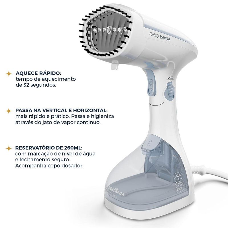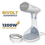Imagine acabar com as dores de cabeça das roupas amassadas de forma rápida e eficiente. A Passadeira a Vapor Britânia Portátil 1200W Bivolt BVP06 chega para revolucionar sua rotina, oferecendo praticidade e resultados impecáveis. Com 1200W de potência e vazão de vapor de 23g/min, ela desamassa tecidos com facilidade, seja no cabide ou na posição horizontal, garante versatilidade para cortinas, almofadas, sofás e até toalhas.Leve e compacta, essa passadeira tem cabeça dobrável e reservatório removível de 260mL, ideal para viagens ou uso diário. Além disso, o acessório escova para remoção de pelos de pets traz ainda mais higiene e funcionalidade ao seu lar. Com bivolt automático, ela se adapta a qualquer tomada, sem complicações.Transforme a tarefa de passar roupas em um momento ágil e satisfatório. Escolha a Passadeira a Vapor Britânia BVP06 e experimente o conforto de roupas impecáveis e um dia a dia mais organizado. Luzes de funcionamento Copo dosador (ml): 50mlQuantidade de furos: 7 furosTempo de uso contínuo: 18minCapacidade de reservatório de água (ml): 260mlAcessórios: EscovaTempo para aquecimento: 32sBivolt automático Temperatura máxima (C°): 98°CChave acionadora de vaporPortátil Taxa de emissão de vapor (g/min): 17g/min.
