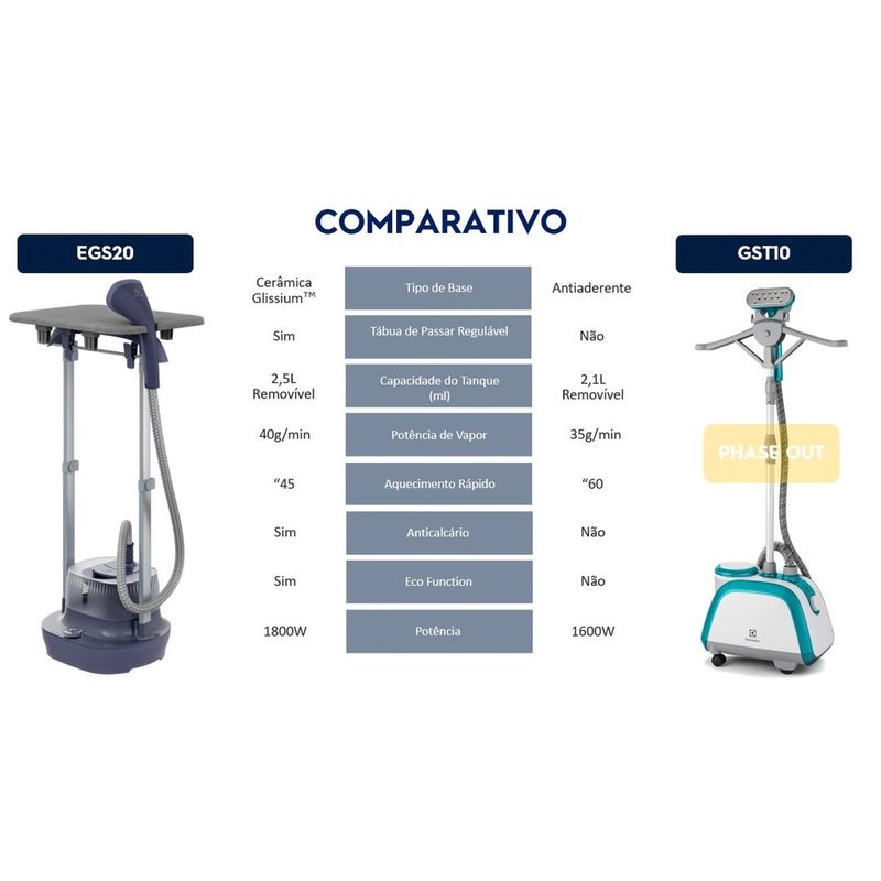 Estar bem-vestido ajuda na autoestima e ainda causa boa impressão por onde passa. As roupas bem passadas e limpas são itens fundamentais, tanto na vida profissional quanto na pessoal, pois refletem sua personalidade e valorizam suas qualidades. Para te ajudar nisso, a Electrolux apresenta o vaporizador de roupas portátil Expert EGS20, que funciona como um ferro de passar a vapor, desamassando as peças com bastante facilidade, cuidado e rapidez. O vaporizador de roupas Electrolux Expert EGS20 oferece facilidade na hora de desamassar suas roupas, além de cuidado com os diferentes tipos de tecidos. Para trazer mais comodidade no seu dia a dia, o vaporizador possui uma tábua de passar regulável. Design pensado para oferecer um maior conforto e praticidade ao passar roupas na vertical ou na horizontal, como você preferir. Conta com reservatório removível com capacidade de 2,5L e até 1 hora de autonomia. Sem deixar de falar nos 1800W de potência. E não para por aí, a função Power Power Steam elimina até 99,99%¹ de bactérias dos tecidos das suas roupas, o que significa mais saúde para toda a família. O vaporizador possui cabo flexível e base Glissium de Fácil usabilidade e deslizamento sobre os tecidos. Você ainda pode usar as três programações de intensidade de saída de vapor. O vaporizador vem com acessórios e em apenas 45 segundos está pronto para ser utilizado.