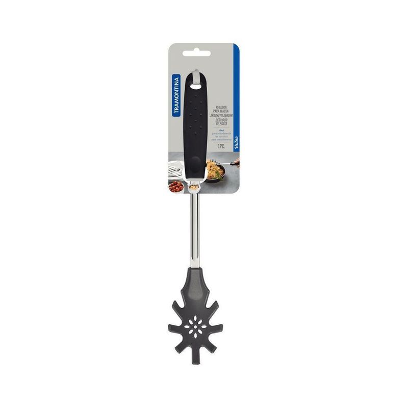 Pegador Massa Nylon C/ Cabo Preto - Tramontina Utilitá 25694/100Detalhes do produtoPermita que o momento à mesa fique ainda mais encantador com o pegador para massa Tramontina Utilitá em nylon com cabo de polipropileno preto. Uma peça da linha Utilità, que oferece para qualquer ocasião mais praticidade e um design diferenciado, levando modernidade e cor para os seus dias. A escolha ideal para tornar todas as ocasiões ainda mais especiais. O pegador para massa é produzido com bojo de nylon nylon que possibilita o uso em panelas com revestimentos antiaderentes e cerâmicos, além disso, possui haste de aço inox e cabo de polipropileno que garante um manuseio confortável e seguro.Informações técnicasPegador para Massa de Nylon que permite uso em temperaturas de até 180 °C e haste de aço inox.O cabo de polipropileno possui furo passante possibilitando que seja pendurado na sua cozinha.Utensílio ideal para uso em panelas com revestimentos antiaderentes e cerâmicos, pois não danifica o produto.Pode ir à máquina de lavar louças facilitando seu dia a dia.Recomendações de usoPara maior durabilidade do produto recomenda-se secar bem antes de guardar, mesmo após lavagem em máquina.Para descarte dos produtos e embalagens siga as orientações de reciclagem vigentes.