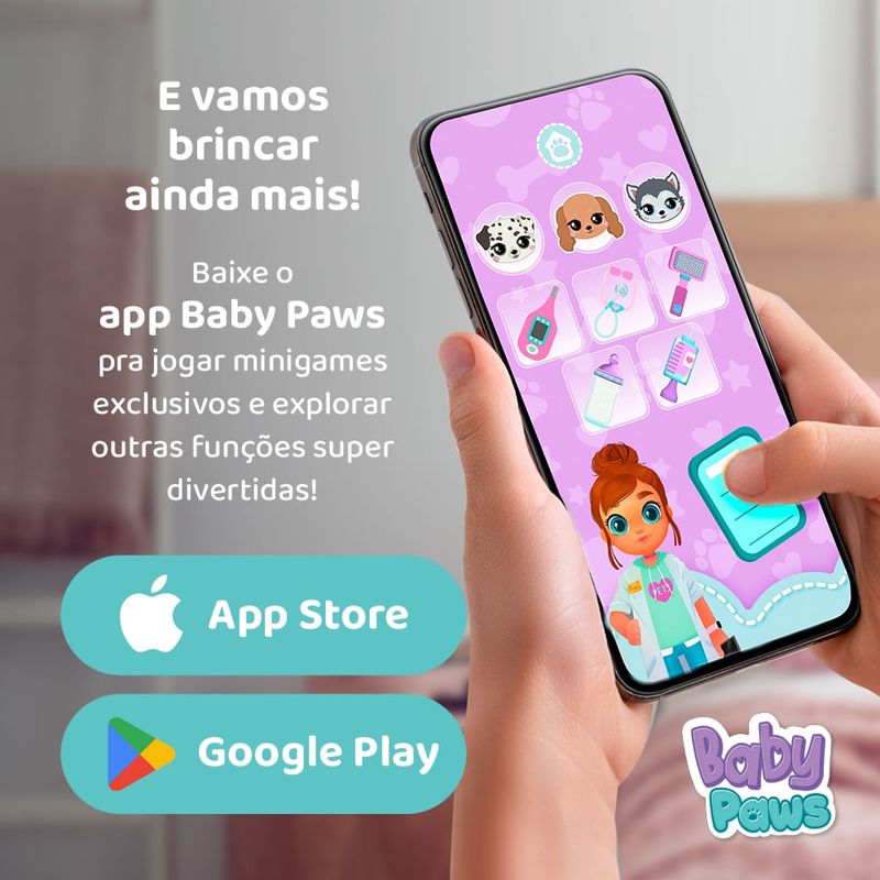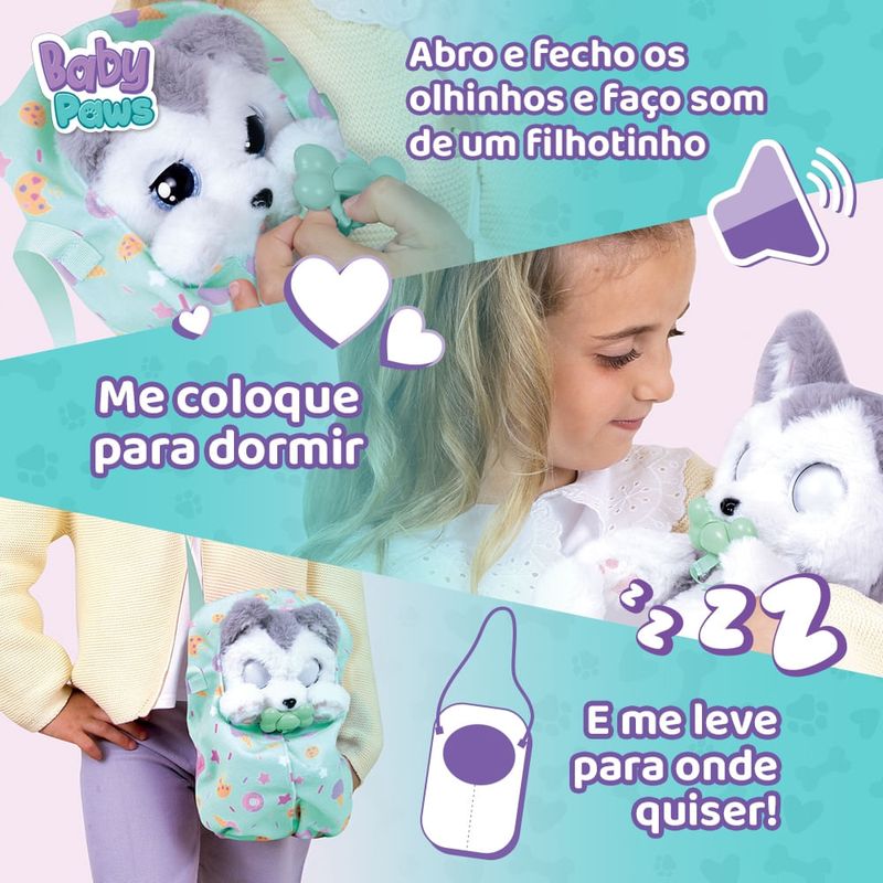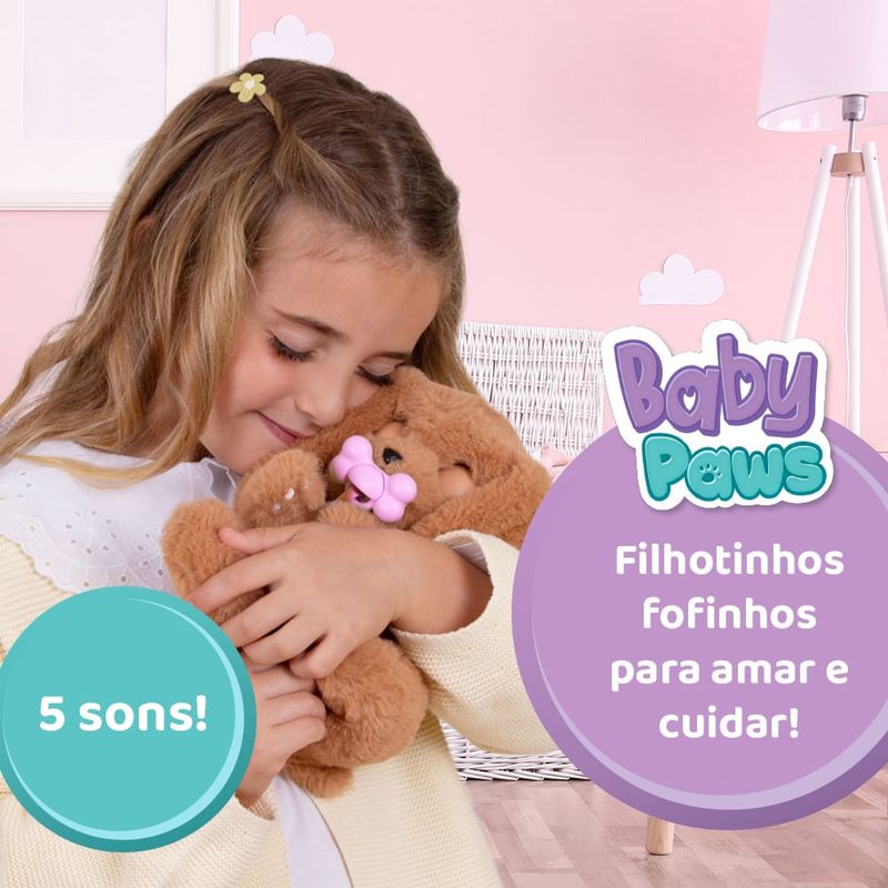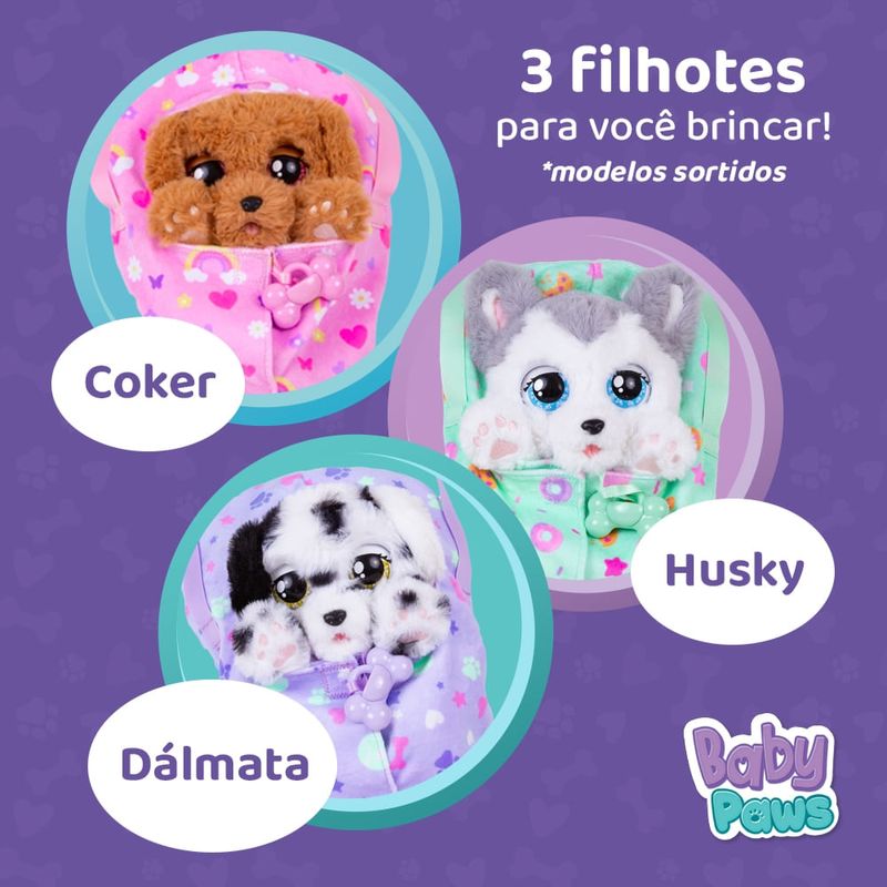 Baby Paws são os filhotes mais fofos que você já viu! Eles adoram ser carregados com você, onde quer que você vá.Tire a chupeta e os veja-os abrir os olhos pela primeira vez enquanto fazem sons fofos. Sons de um filhotinho!Quando você os tira do cobertor, você descobre seu corpinho macio e fofinho!Quando é hora de dormir, coloque a chupeta e eles vão adormecer enquanto fazem sons de cachorrinho.Acompanham uma bolsa personalizada de cada raça para levar seu filhote para todos os lugares com você.Modelos Sortidos Surpresa - Não é possível escolher o modeloImagens meramente ilustrativas