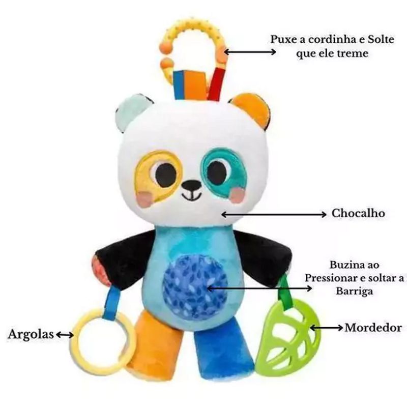O Plush de Atividades Panda é um brinquedo perfeito para a primeira infância, estimulando habilidade motora, auditiva e visual da criança. É feito com materiais macios e seguros para a criança, e possui argolinhas coloridas para o bebê segurar e brincar. O enchimento do Panda produz um som suave de amassadinho quando apertado, além de possuir buzina e chocalho, o que estimula o desenvolvimento sensorial e a curiosidade do bebê. O Plush de atividades Panda também possui um mordedor, que é ótimo para a fase da dentição do bebê. Puxe o Unicórnio para baixo e ele vibra! Com sua combinação de texturas, cores e sons, este brinquedo de pelúcia é um companheiro divertido e educativo para o seu pequeno explorador. Características: Plush de atividades Panda da coleção Bubazoo Ajuda a desenvolver a habilidade motora e visual Com argolinhas, enchimento com som de amassadinho, buzina, chocalho e mordedor Puxe o Unicórnio para baixo e ele vibra! É macio, divertido, resistente e de fácil manuseio Perfeito para decoração de carrinhos e berços Confira toda a Coleção Bubazoo Especificações: Idade recomendada: a partir dos 4 meses (4m+) Conteúdo: 1 unidade Composição: Tecido: 100% Poliester; Chocalho: 100% Poliestireno (PS); Buzina: 100% EVA; Cabide: 75% Polipropileno (PP) e 25% Acetato-Vinilo de Etileno (EVA); Mordedor: 100% Acetato-Vinilo de Etileno (EVA) e Anel: 100% Acrilonitrila Butadieno Estireno (ABS) Dimensões aproximadas (AxLxP): 31cm x 16cm x 10cm As cores podem variar entre as imagens e o produto Imagens meramente ilustrativas Certificado Inmetro: Registro: 007782/2021