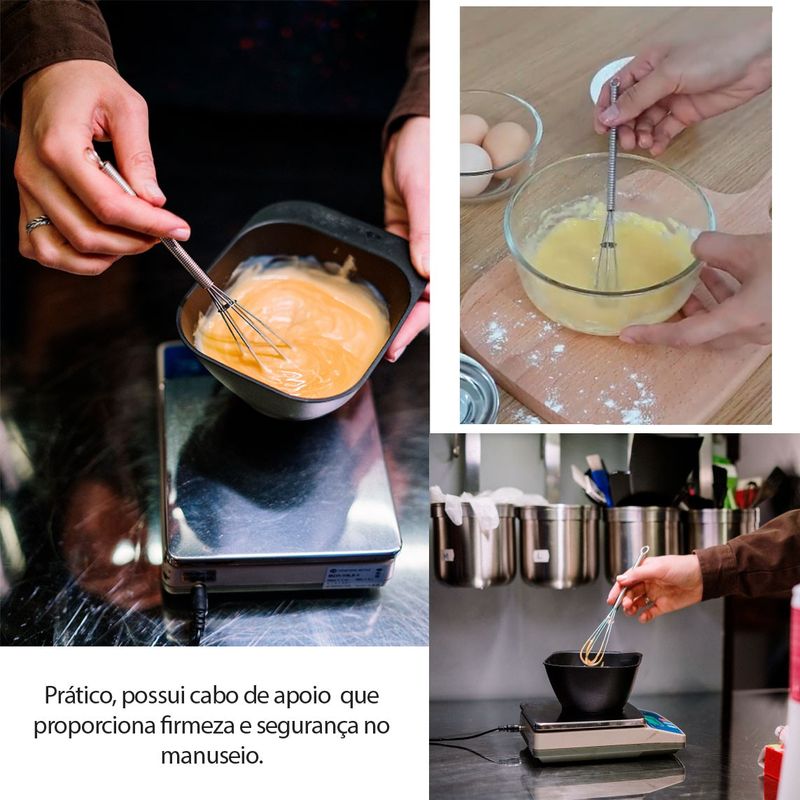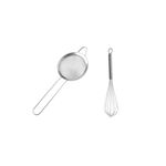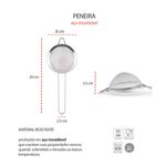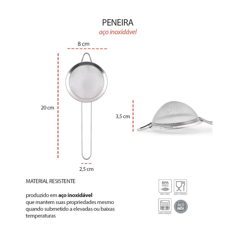 Peneira Inox e Mini Batedor de Claras. A peneira é desenvolvida em aço inoxidavel, o que torna a peça leve, pratica e muita facil de limpar. Um utensilios que toda cozinha, seja ela profissional ou nao, tem em comum, sao as peneiras. Ideais para separar um alimento do outro de forma rapida e simples, as peneiras sao muito conhecidas na confeitaria. Fabricada com material de alta qualidade e resistencia, ela nao oxida e nao absorve o sabor ou cheiro de alimentos. Mini Ralador de queijo aço inoxidavel. O batedor de ovos é totalmente fabricada em aço inox, nao solta nenhum residuo nos alimentos, e traz muito mais resistencia. Contem: 1 Peneira Pequena Medidas: 20 x 8 x 3,5 cm 1 Batedor de Claras Dimensao: 19 x 5 cm Peso: 25 gramas Material: Aço inoxidavel