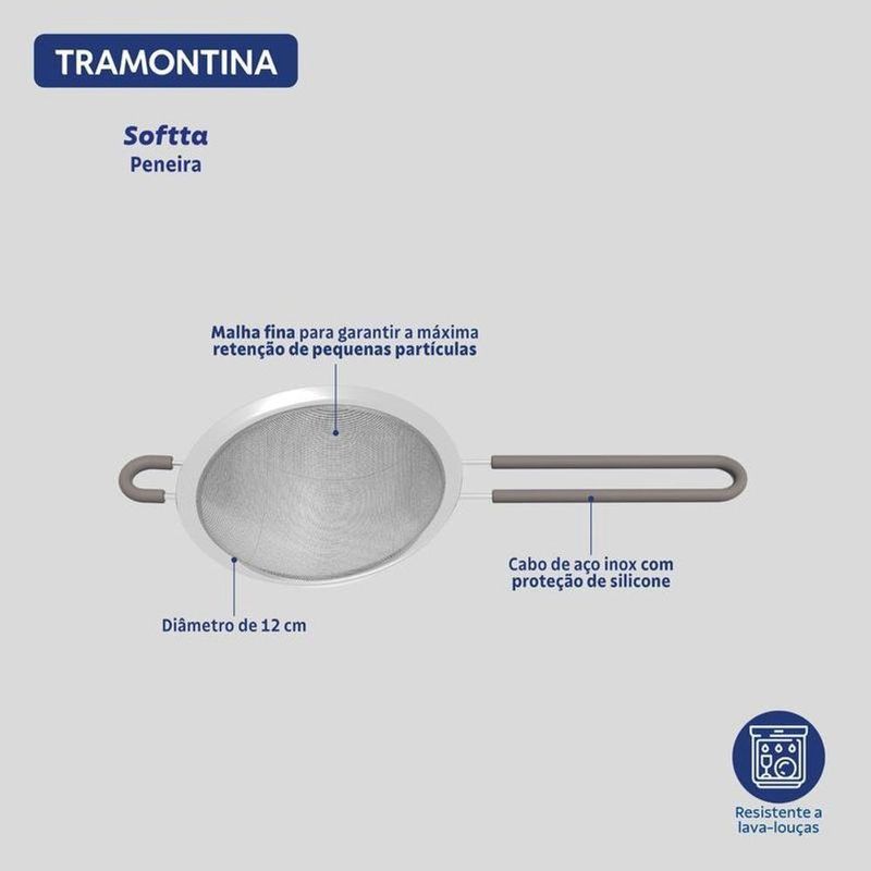 Peneira Tramontina Softta Cinza Aço Inox Com Cabo E Alça Em Silicone 12cmQuando o preparo exige precisão, cada detalhe importa. A peneira Tramontina Softta em aço inox com cabo e alça em silicone cinza, de 12 centímetros, resultados refinados com praticidade. A malha fina filtra os ingredientes com eficiência, retendo até as menores partículas e garantindo texturas leves e homogêneas. Fabricada em inox, é resistente e simples de higienizar, enquanto o cabo em silicone proporciona manuseio confortável e . com lava-louças, ela facilita o dia a dia sem abrir mão da qualidade no preparo.Recomendações de Uso:Modo de uso: ;Para maior durabilidade do produto recomenda-se secar bem antes de guardar, mesmo após lavagem em máquina. Para descarte dos produtos e embalagens siga as orientações de reciclagem vigentes.- Foto meramente ilustrativa.Informações Adicionais:- Pode ir à máquina de lavar louças facilitando seu dia a dia.- Peneira de aço inox com suporte para apoio em outros utensílios;- Utensílio ideal para peneirar farinhas ou coar chás, sucos de frutas e outros;- O cabo de polipropileno possui furo passante possibilitando que seja pendurado na sua cozinha.