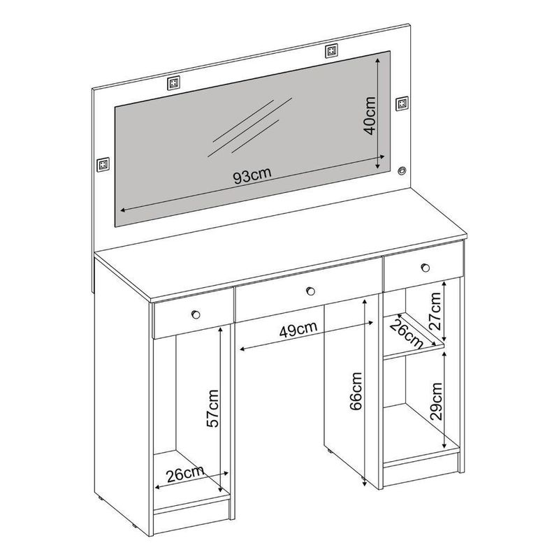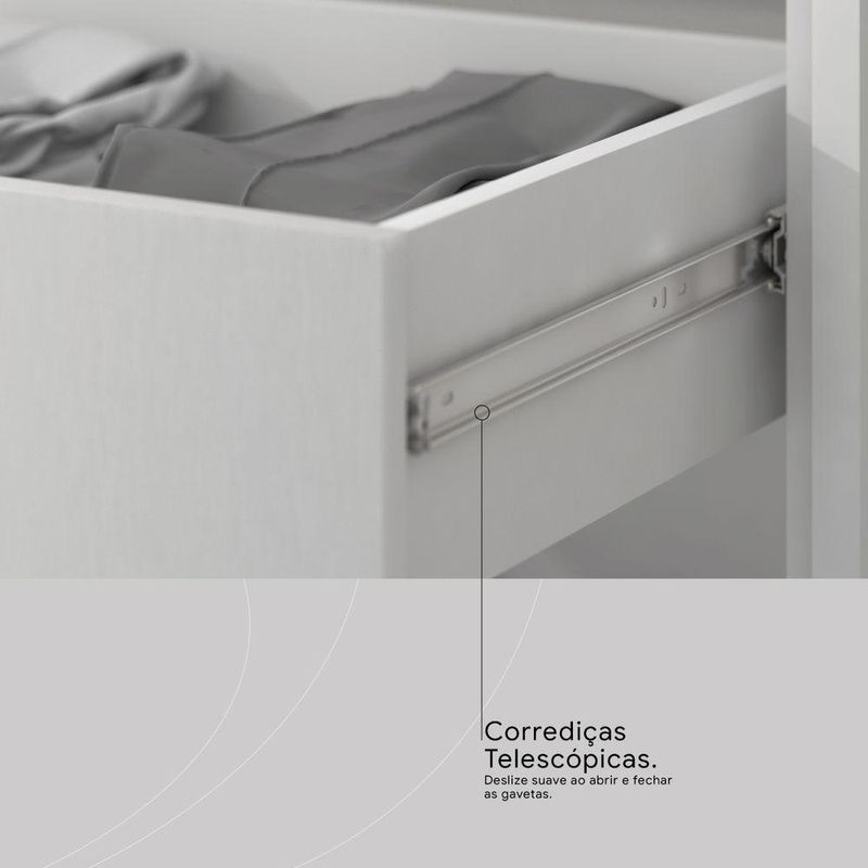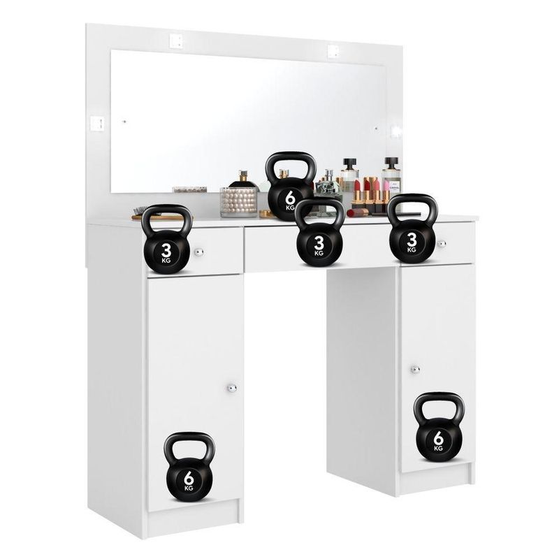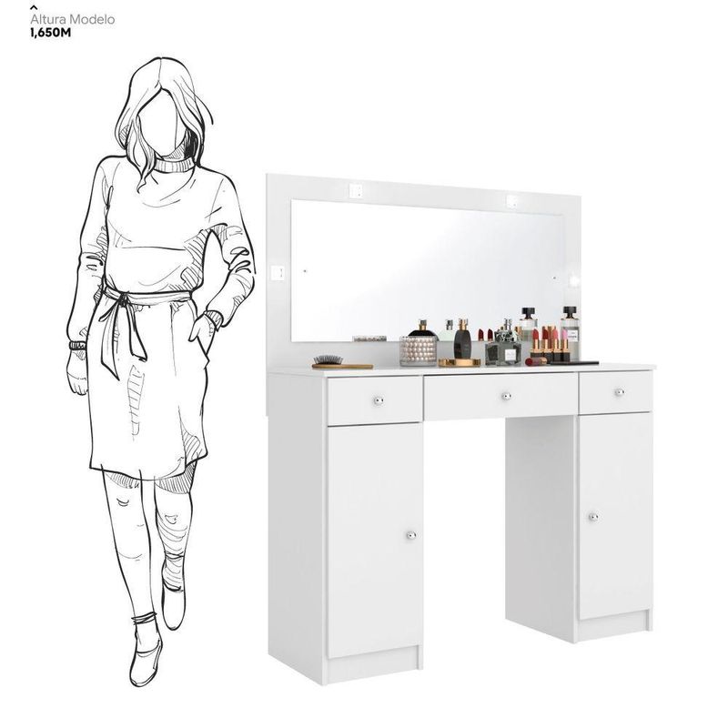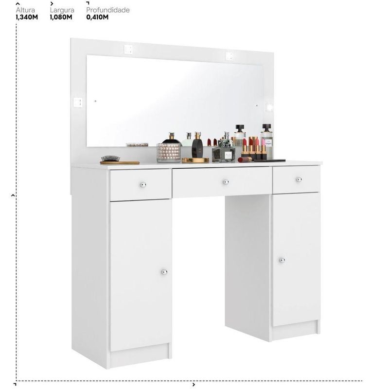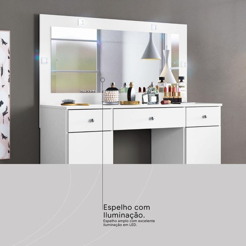 Penteadeira Camarim Carisma 3 Gavetas com Espelho LED MDP Branco Brilhante Corrediças TelescópicasOrganize seus itens de beleza com a penteadeira camarim Élpis Móveis Carisma, ideal para tornar o momento de se arrumar mais prático e agradável. Com 3 gavetas com corrediças telescópicas, oferece abertura completa e mais estabilidade para acessar maquiagens e acessórios. As divisórias internas ajudam a manter tudo bem separado, enquanto o amplo espelho com iluminação em LED proporciona excelente visibilidade na hora da maquiagem. O acabamento branco brilhante em MDP combina facilmente com diferentes estilos de quarto ou closet. Uma opção funcional para quem busca organização e boa iluminação no dia a dia.Vantagens e diferenciais Gavetas com corrediças telescópicas: abertura completa e mais estabilidade no uso diário. Divisórias internas: organização prática para maquiagens, acessórios e pequenos objetos. Espelho amplo com LED: iluminação eficiente para uma maquiagem mais precisa. Acabamento branco brilhante: visual moderno que harmoniza com diversos ambientes. Dimensões compactas: medidas pensadas para otimizar o espaço do quarto ou closet.Especificações Técnicas Marca: Élpis Móveis Modelo: Carisma Tipo de produto: Penteadeira camarim Material da estrutura: MDP Acabamento: Branco brilhante Altura: 134 cm Largura: 108 cm Profundidade: 41 cm Peso: 36,20 kg Quantidade de gavetas: 3 Quantidade de portas: 2 Tipo de corrediça: Corrediças telescópicas Possui espelho: Sim Tipo de iluminação: LED Requer montagem: SimObservações importantes A montagem ou instalação é de responsabilidade do comprador. Verifique se o local de entrega possui espaço e acesso adequados conforme as dimensões do produto. A entrega é realizada no térreo, não incluindo subida de escadas ou içamento. O produto não acompanha itens decorativos ou acessórios utilizados nas imagens.