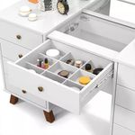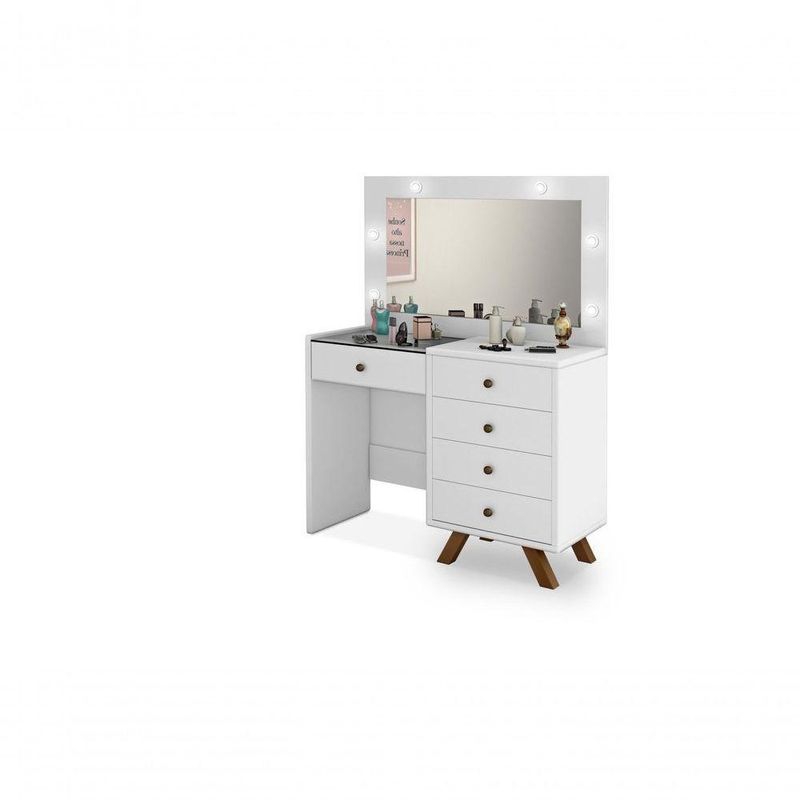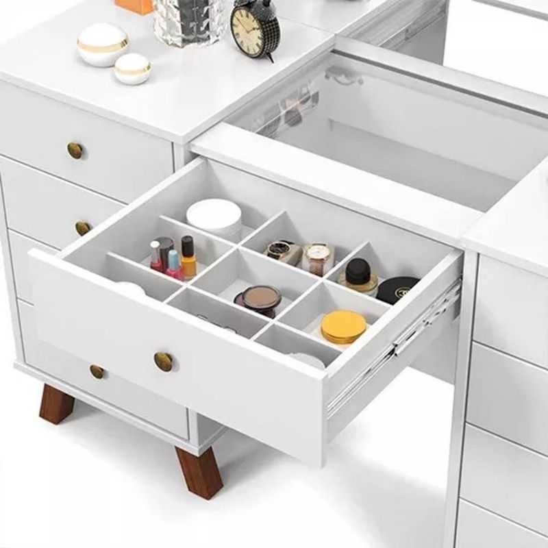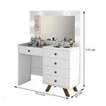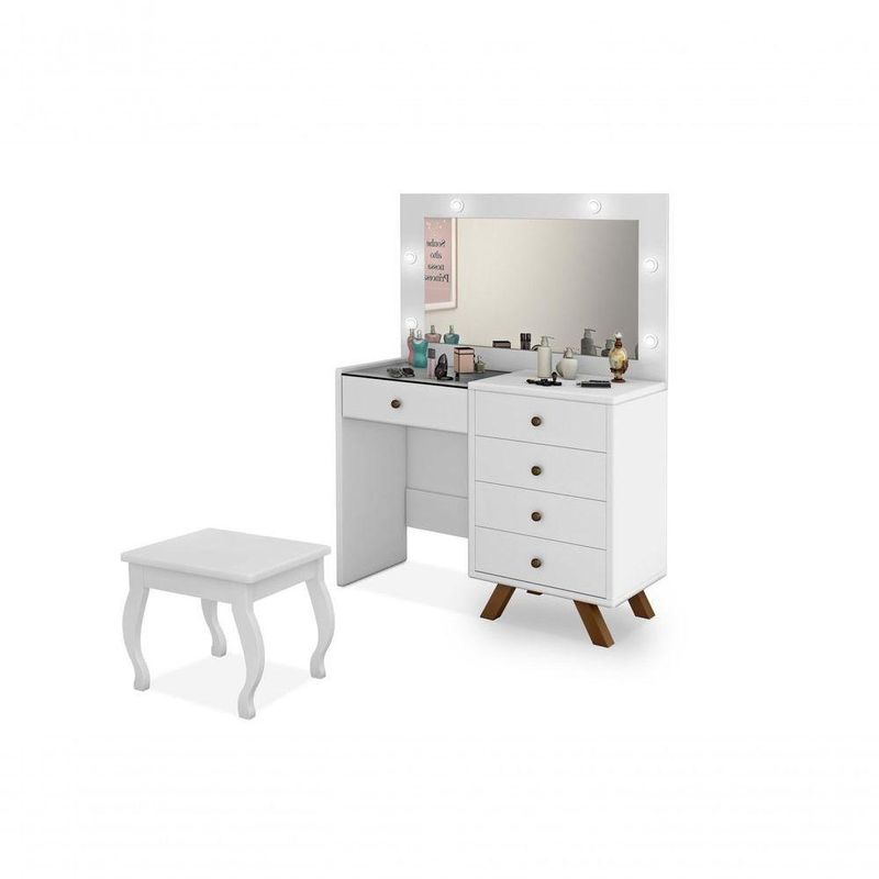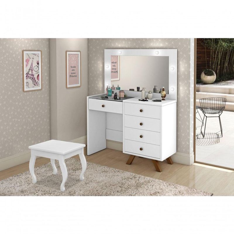 Penteadeira Camarim Luna 9 Gavetas com Espelho LED Retrô MDF Branco Brilhante com Corrediças TelescópicasOrganize maquiagens, acessórios e cosméticos com a penteadeira camarim Luna, modelo retrô com espelho e LED ideal para o quarto ou closet. Com 9 gavetas, incluindo gaveta central com colmeia, oferece espaço dedicado para manter cada item sempre à mão. O espelho inteiro com kit de LED bivolt integrado garante iluminação de qualidade, favorecendo a visualização dos detalhes na hora de se maquiar ou arrumar os cabelos. A estrutura em MDF com acabamento branco brilhante combina facilmente com diferentes estilos de decoração. Os pés em madeira e as corrediças telescópicas contribuem para um uso prático no dia a dia.Vantagens e diferenciais 9 gavetas espaçosas: organizam maquiagens, acessórios e cosméticos com facilidade. Gaveta central com colmeia: separa pequenos itens para acesso rápido e visual organizado. Espelho inteiro com LED: oferece iluminação uniforme para maior precisão na maquiagem. Acabamento branco brilhante: visual clean que harmoniza com diversos estilos de quarto. Corrediças telescópicas: proporcionam abertura suave e prática das gavetas. Pés em madeira: conferem estabilidade ao móvel e reforçam o estilo retrô.Especificações Técnicas Modelo: Luna Tipo de produto: Penteadeira camarim Estilo: Retrô/Vintage Material da estrutura: MDF Cor predominante: Branco Acabamento: Brilhante Quantidade de gavetas: 9 Gaveta central: com colmeia organizadora Tipo de corrediça: Corrediças telescópicas Possui espelho: Sim, espelho inteiro Tipo de iluminação: LED Kit de LED: com interruptor bivolt (110/220) Pés: em madeira Altura do produto: 93,5 cm Largura do produto: 145 cmObservações importantes A montagem ou instalação é de responsabilidade do comprador. Verifique se o local de entrega possui espaço e acesso adequados conforme as dimensões do produto. A entrega é realizada no térreo, não incluindo subida de escadas ou içamento. O produto não acompanha itens decorativos ou acessórios utilizados nas imagens.
