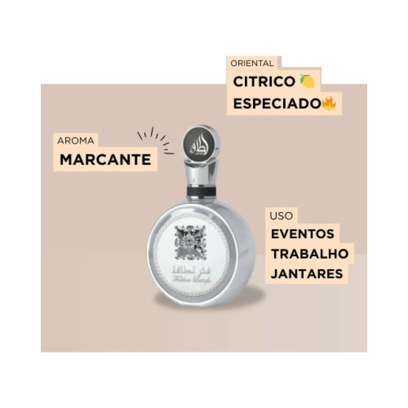 Um perfume que encanta desde a primeira borrifada O Fakhar Platin apresenta uma composição olfativa rica e equilibrada, que revela diferentes nuances a cada momento: Notas de saída (topo): Frescor vibrante e sedutor que desperta os sentidos. Notas de coração (corpo): Um bouquet harmonioso que mistura elementos florais e especiados, trazendo profundidade e charme únicos. Notas de fundo (base): Toques amadeirados e orientais que garantem uma fixação prolongada e um rastro inesquecível. Por que escolher o Perfume Fakhar Platin Lattafa? Originalidade e qualidade: Produto 100% original, importado, com alta concentração de essência para máxima durabilidade. Versatilidade: Perfeito para uso diário ou eventos especiais, adaptação para todos os estilos e ocasiões. Design sofisticado: Frasco elegante e moderno que valoriza sua coleção e oferece praticidade no uso. Detalhes do produto Conteúdo: 100ml Tipo: Eau de Parfum Marca: Lattafa Fixação: Longa duração Público: Unissex – ideal para quem aprecia fragrâncias intensas e refinadas