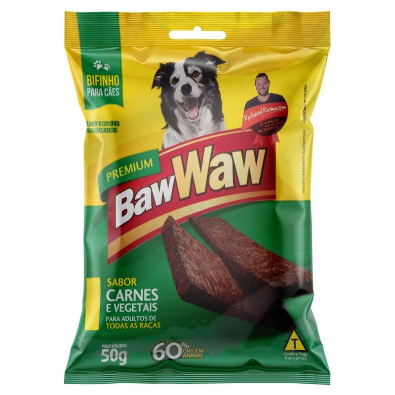 Petisco Baw Waw C?o Pequeno Bifinho Carne e Vegetais 50gO Petisco Baw Waw Cão Pequeno Bifinho Carne e Vegetais é um complemento alimentar composto por 60% de carne. Ideal para cães de pequeno porte de todas as raças e pode ser usado em forma prêmio ou recompensa para seu bichinho.