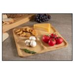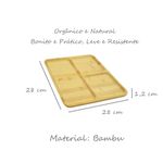 Suporte com divisória em bambu orgânico e natural, perfeita para petisqueira ou gamela. A petisqueira é resistente, pratica e fica incrível na hora de servir. O suporte em bambu é produzido em material leve, durável e 100% ecológico já que é renovável e não poluente. As fibras do bambu possuem um agente orgânico que previne a proliferação de bactérias e o aparecimento de fungos. Esse bactericida natural, aliado à baixa absorção de umidade, faz com que os utensílios de bambu sejam mais duráveis e higiênicos, em comparação com os tradicionais de madeira. Contêm: 1 Petisqueira Medidas: 28 x 28 x 1,2 cm Material: Bambu Casacha é uma loja especializada em utensílios para cozinha e organização da casa.