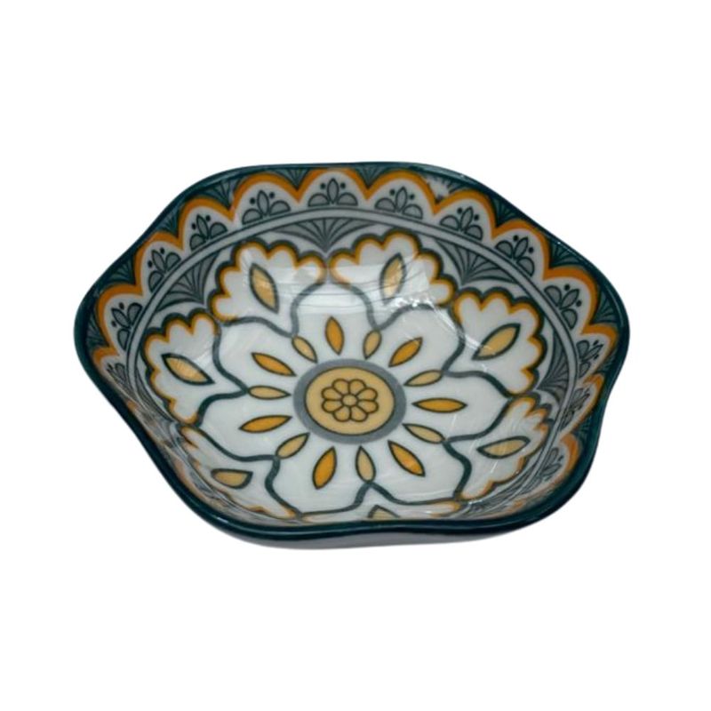 Bela Petisqueira com 4 divisorias e 2 Mini Bowl e 2 espatulas para os petiscos modelo: grande Tamanho: comprimento 33 cm Largura: 19,5 cm altura 1,5 cm Espatula: 8 cm Mini Bowl de ceramica: diametro 9,5 cm São modelos do mini bowl, serão enviados os disponiveis, todos da mesma marca e modelo, mudando as estampas.