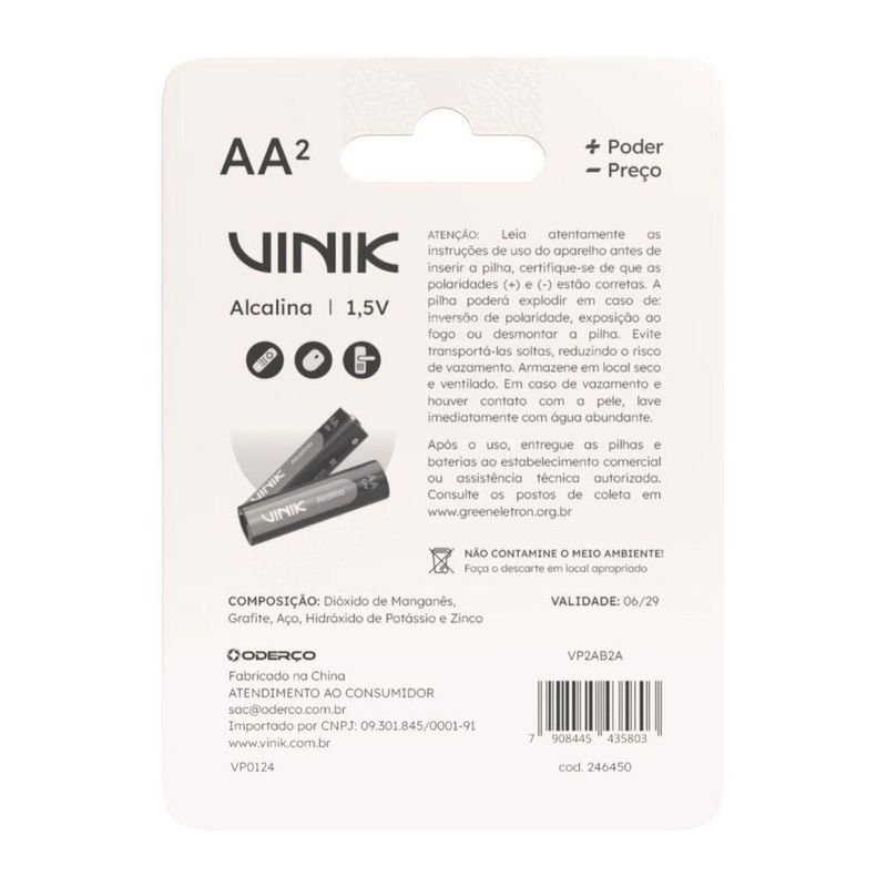 Pilha Alcalina Aa C/2 1.5v - Vp2ab2aPILHA ALCALINA AA C/2 1.5V - VP2AB2A As pilhas e baterias Vinik são a escolha perfeita para diversas situações, oferecendo desempenho confiável e durabilidade para todos os tipos de dispositivos. Seja para controles remotos, videogames, lanternas, sensores, brinquedos ou muitos outros aparelhos, nossas pilhas garantem energia quando você mais precisa. Disponíveis em uma ampla variedade de tipos e tamanhos, projetadas para atender às suas necessidades com eficiência e qualidade. Mais potência por menos preço. Características Tipo: Alcalina Tamanho: LR6 - AA Voltagem: 1,5V Blister: 2 unidades