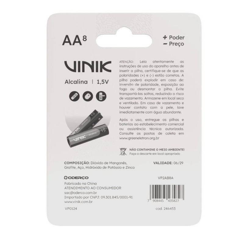 Pilha Alcalina Aa C/8 1.5v Vp2abDescubra a confiabilidade e eficiência das pilhas alcalinas AA C/8 1.5V da Vinik. Projetadas para atender às suas necessidades específicas, essas pilhas oferecem desempenho confiável e durabilidade para todos os tipos de dispositivos. Seja para controles remotos, videogames, lanternas, sensores, brinquedos ou muitos outros aparelhos, essas pilhas garantem energia quando você mais precisa.Com sua ampla variedade de tipos e tamanhos, é fácil encontrar a opção certa para seu dispositivo. Nossas pilhas são concebidas para entregar mais potência por menos preço, garantindo que você obtenha o valor que precisa sem sacrificar o desempenho.As pilhas alcalinas AA C/8 1.5V da Vinik destacam-se por suas características: tipo alcalina, tamanho LR6 - AA, voltagem de 1,5V e blister de 8 unidades. Com essas características, você pode ter certeza de que está obtendo uma pilha de alta qualidade que atende às suas necessidades específicas.Descubra a confiabilidade e eficiência das pilhas alcalinas AA C/8 1.5V da Vinik. Projetadas para atender às suas necessidades específicas, essas pilhas oferecem desempenho confiável e durabilidade para todos os tipos de dispositivos. Seja para controles remotos, videogames, lanternas, sensores, brinquedos ou muitos outros aparelhos, essas pilhas garantem energia quando você mais precisa.Com sua ampla variedade de tipos e tamanhos, é fácil encontrar a opção certa para seu dispositivo. Nossas pilhas são concebidas para entregar mais potência por menos preço, garantindo que você obtenha o valor que precisa sem sacrificar o desempenho.As pilhas alcalinas AA C/8 1.5V da Vinik destacam-se por suas características: tipo alcalina, tamanho LR6 - AA, voltagem de 1,5V e blister de 8 unidades. Com essas características, você pode ter certeza de que está obtendo uma pilha de alta qualidade que atende às suas necessidades específicas.