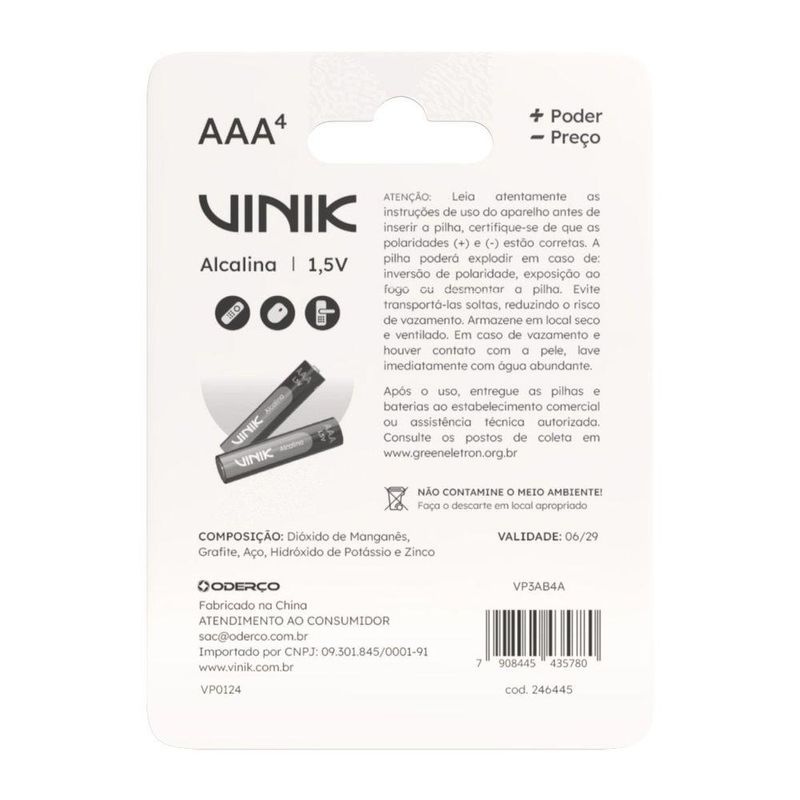Pilha Alcalina Aaa C/4 1.5v - Vp3ab4aPILHA ALCALINA AAA C/4 1.5V - VP3AB4A As pilhas e baterias Vinik são a escolha perfeita para diversas situações, oferecendo desempenho confiável e durabilidade para todos os tipos de dispositivos. Seja para controles remotos, videogames, lanternas, sensores, brinquedos ou muitos outros aparelhos, nossas pilhas garantem energia quando você mais precisa. Disponíveis em uma ampla variedade de tipos e tamanhos, projetadas para atender às suas necessidades com eficiência e qualidade. Mais potência por menos preço. Características Tipo: Alcalina Tamanho: LR03 - AAA (palito) Voltagem: 1,5V Blister: 4 unidades