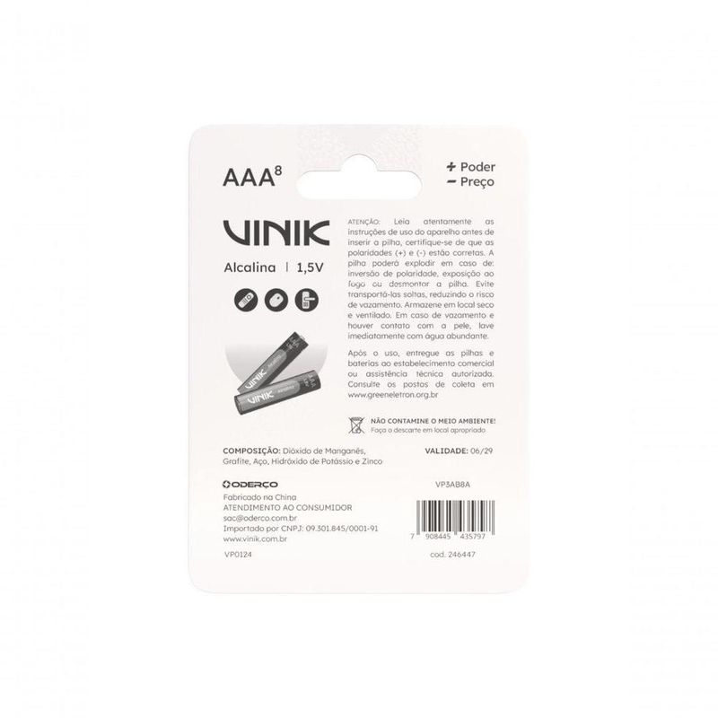 Pilha Alcalina Aaa C/8 1.5v - Vp3ab8aPILHA ALCALINA AAA C/8 1.5V - VP3AB8A As pilhas e baterias Vinik são a escolha perfeita para diversas situações, oferecendo desempenho confiável e durabilidade para todos os tipos de dispositivos. Seja para controles remotos, videogames, lanternas, sensores, brinquedos ou muitos outros aparelhos, nossas pilhas garantem energia quando você mais precisa. Disponíveis em uma ampla variedade de tipos e tamanhos, projetadas para atender às suas necessidades com eficiência e qualidade. Mais potência por menos preço. Características Tipo: Alcalina Tamanho: LR03 - AAA (palito) Voltagem: 1,5V Blister: 8 unidadesPILHA ALCALINA AAA C/8 1.5V - VP3AB8A As pilhas e baterias Vinik são a escolha perfeita para diversas situações, oferecendo desempenho confiável e durabilidade para todos os tipos de dispositivos. Seja para controles remotos, videogames, lanternas, sensores, brinquedos ou muitos outros aparelhos, nossas pilhas garantem energia quando você mais precisa. Disponíveis em uma ampla variedade de tipos e tamanhos, projetadas para atender às suas necessidades com eficiência e qualidade. Mais potência por menos preço. Características Tipo: Alcalina Tamanho: LR03 - AAA (palito) Voltagem: 1,5V Blister: 8 unidades