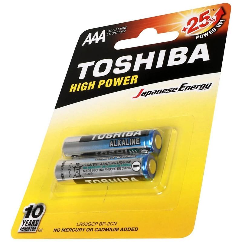 Pilha Alcalina AAA Toshiba 1,5V LR03GCP (C/2 Pilhas)A pilha alcalina da Toshiba foi desenvolvida para garantir longa duração nos mais diferentes aparelhos, principalmente nos que requerem alta drenagem de energia. Além disso, sem adição de mercúrio e cádmio, não agride o meio ambiente.Além disso, este modelo é ideal para: brinquedos, controles remotos, consoles de jogos portáteis, fechaduras eletrônicas, lanternas, mouse e teclados sem fio, relógios, calculadoras, rádios portáteis e comunicadores e muito mais.