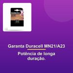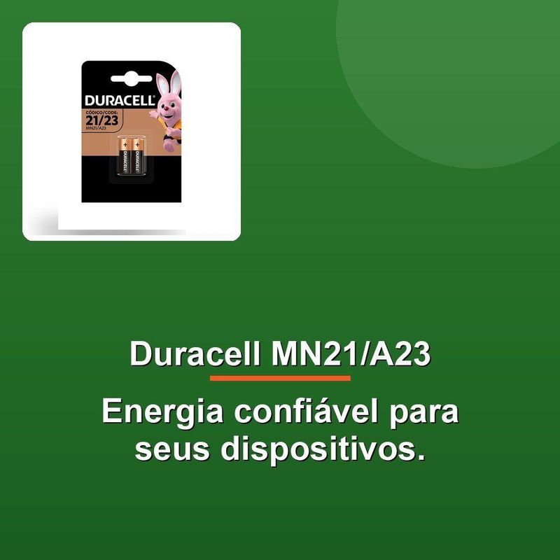Pilha Alcalina Mn21/a23 Duracell C/2Confie em nossas Pilhas Alcalinas 12V MN21/A23, especialmente projetadas para dispositivos médicos, de segurança e eletrônicos. Com uma tensão de 12V, essas pilhas são ideais para termômetros, glucosímetros, instrumentos de pressão sanguínea, leitores de cartão de banco, transmissores de alarme, brinquedos, controles de garagem, relógios, calculadoras e lasers.Nossas pilhas alcalinas especiais MN21 são fabricadas com a tecnologia de Duracell, quepreserve a energia das pilhas que ainda não foram usadas por até 5 anos. Isso significa que você pode armazenar nossas pilhas por mais tempo, sem ter que se preocupar com a perda de sua potência.Com uma embalagem prática que inclui 2 pilhas, você estará preparado para substituir as pilhas de seus dispositivos em qualquer momento. Além disso, as características de nossas pilhas alcalina MN21 incluem um tamanho 21/23 e uma tecnologia que as torna confiáveis e seguras para uso em uma variedade de aplicações.Escolha nossas Pilhas Alcalinas 12V MN21/A23 e desfrute de uma potência confiável e longa duração para seus dispositivos.Confie em nossas Pilhas Alcalinas 12V MN21/A23, especialmente projetadas para dispositivos médicos, de segurança e eletrônicos. Com uma tensão de 12V, essas pilhas são ideais para termômetros, glucosímetros, instrumentos de pressão sanguínea, leitores de cartão de banco, transmissores de alarme, brinquedos, controles de garagem, relógios, calculadoras e lasers.Nossas pilhas alcalinas especiais MN21 são fabricadas com a tecnologia de Duracell, quepreserve a energia das pilhas que ainda não foram usadas por até 5 anos. Isso significa que você pode armazenar nossas pilhas por mais tempo, sem ter que se preocupar com a perda de sua potência.Com uma embalagem prática que inclui 2 pilhas, você estará preparado para substituir as pilhas de seus dispositivos em qualquer momento. Além disso, as características de nossas pilhas alcalina MN21 incluem um tamanho 21/23 e uma tecnologia que as torna confiáveis e seguras para uso em uma variedade de aplicações.Escolha nossas Pilhas Alcalinas 12V MN21/A23 e desfrute de uma potência confiável e longa duração para seus dispositivos.