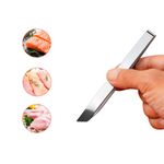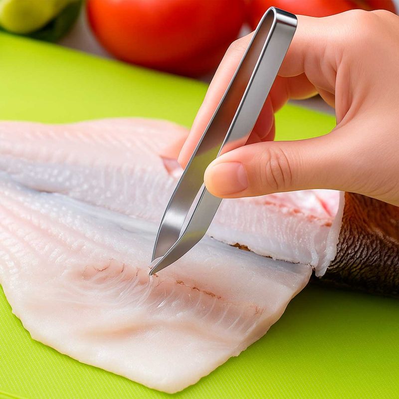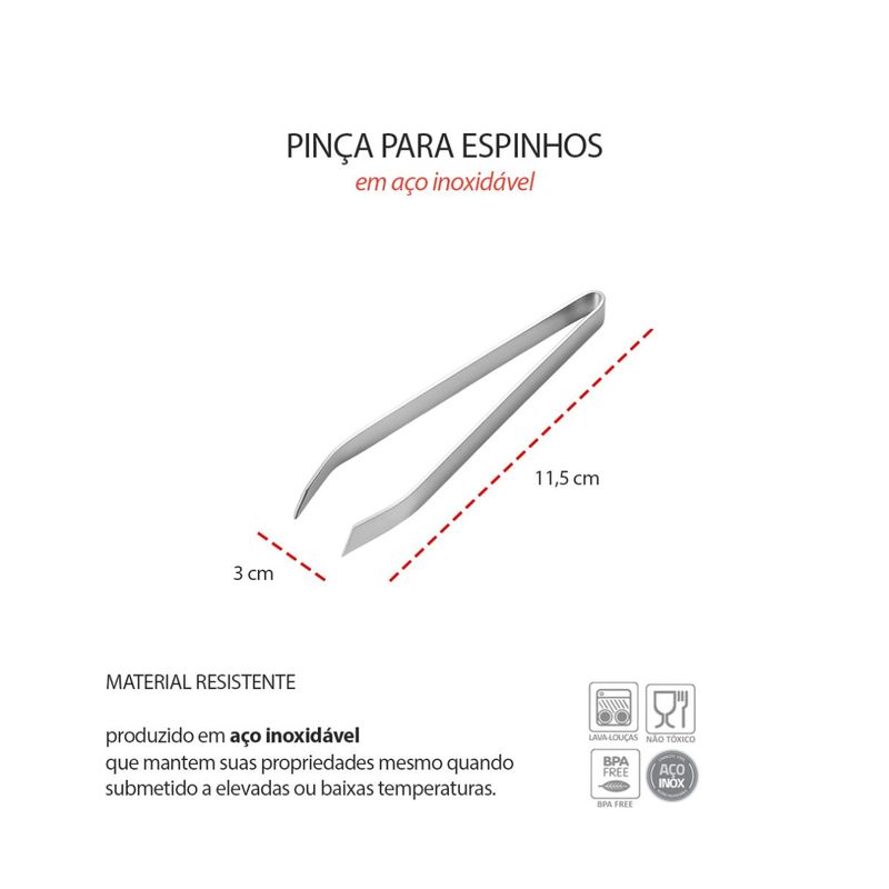 A Pinça para Peixe é perfeita para quem consome peixe com frequencia, especialmente os que possuem muitos espinhos e exigem precisao no manuseio. Suas extremidades anguladas garantem firmeza e controle ao remover espinhos, tornando o processo mais facil e seguro. Produzida em aço inoxidavel de alta qualidade, é resistente, duravel e ideal tanto para uso domestico quanto profissional. Alem de elegante, é higienica, facil de limpar e mantem suas caracteristicas originais por muito mais tempo, preservando a beleza e a eficiencia do material. Contem:1 Pinça Culinaria Medidas: 11,5 x 3 cmMaterial: Aço Inoxidavel