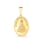 O pingente é fabricado em Ouro 18k trazendo inscrições em alto relevo. A peça possui um belo símbolo de proteção, sendo ideal para presentear quem se ama ou para si mesmo. Compre online seu Pingente Nossa Senhora Aparecida em Ouro 18k. Acompanha embalagem para presente e certificado de garantia. Enviamos para todo o Brasil. Joia em Ouro Amarelo 10k Pingente de Ouro Altura aproximada: 2 cm Preço referente ao pingente, corrente não acompanha a peça. Todas as joias acompanham embalagem para presente, certificado de garantia e nota fiscal. Veja mais Pingentes de Ouro