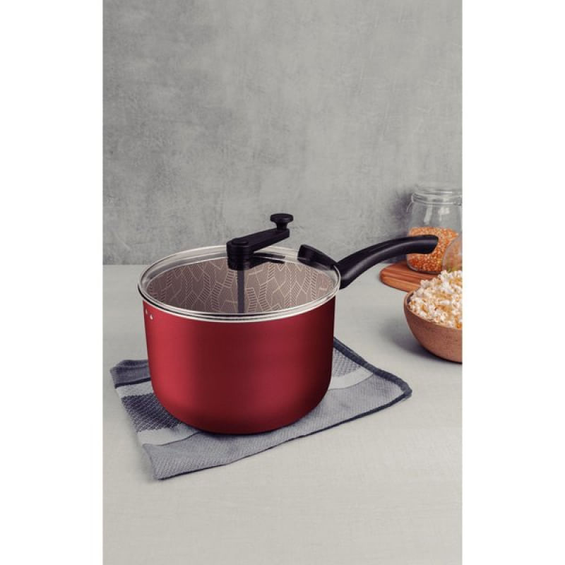 Pipoqueira Tramontina Paris Alumínio Antiaderente Starflon Max Vermelho 22cm 4,8L Tramontina - A pipoqueira Tramontina Paris em alumínio com revestimento interno e externo em antiaderente Starflon Max vermelho 22 centímetros de diâmetro 4, 8 litros é a escolha ideal para preparar aquela pipoca saborosa para seu lanche e acompanhar seu filme preferido. Com produção em alumínio com revestimento interno e externo em antiaderente Starflon Max, ela garante que o milho da pipoca estoure rapidamente e uniformemente, sem que grudem em sua superfície. Sua tampa é em vidro temperado com borda de silicone, não gira durante o preparo e garante um manuseio mais seguro, pois seu cabo e manípulo são em materiais antitérmicos. A pipoqueira ainda é superfácil de limpar e pode ser lavada na máquina de lavar louças! Características Gerais do Produto: Garantia: • 90 dias para vícios ou defeitos de fabricação.