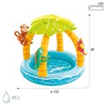 Piscina Inflável Ilha Tropical Infantil Com Cobertura 45 Litros IntexEsta pequena piscina inflável em forma de ilha tropical, para além de atrair as crianças pelo seu design, inclui três animais infláveis que acrescentam diversão extra.Para maior segurança durante o banho, incorpora um piso acolchoado e um guarda-sol em forma de palmeira que protege as crianças do sol.É feito de vinil forte e durável e seu anel inferior inflável oferece estabilidade.Características- Marca: Intex;- Ref: 58417;- Capacidade para 45 litros;- Feito de vinil resistente com espessura de 0,25 mm;- Com guarda-sol em forma de palmeira;- Piso almofadado para maior segurança;- Macaco inflável, iguana e papagaio;- Encha com água até uma altura máxima de 13 cm;- Seu uso é recomendado para crianças entre 1-3 anos- Dimensões: 102 cm de diâmetro e 86 cm de alturaPiscina Inflável Ilha Tropical Infantil com Cobertura 45 Litros Intex