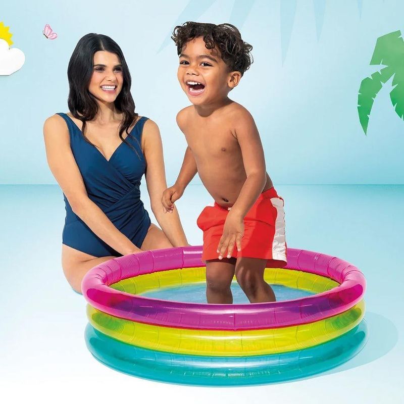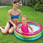 Piscina Inflável Infantil 63 Litros Redonda Arco-íris 86cm IntexNo Verão todas as crianças gostam de passar horas e horas na água, com a piscina infláveil infantil terá sempre a opção de levar consigo e de colocar em qualquer lugar para que os mais pequenos possam se divertir ao máximo. Com a piscina arco-íris INTEX para crianças a diversão é garantida, escolha o design e o tamanho que os seus filhos mais gostam e entre na água!Caracteristicas:- Marca. INTEX;- Ref. 57104;- Material vinílico resistente com uma espessura de 0,20 mm na parede e 0,18 mm no chão;- Impressão Arco-Íris: rosa, amarelo e azul;- Capacidade de 63 Litros;- Recomendado para utilização por crianças entre 1 e 3 anos de idade, mas sempre sob a supervisão de um adulto;- Inclui remendos para reparar possíveis poros ou arranhões;- Piscina inflável com capacidade para até 63 litros de água ou pode ser utilizada como piscina de bolinhas, fácil montagem e transporte;- Dimensôes. 86 x 25cm;Piscina Inflável Infantil 63 Litros Redonda Arco-Ãris 86cm Intex