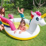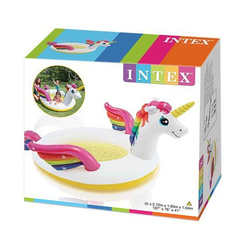 Piscina Inflável Spray Unicórnio Místico Infantil 151 Litros IntexPiscina inflável infantil com forma de unicórnio. É uma piscina muito colorida, uma vez que o corpo do unicórnio é branco, o chifre e base amarelos e tanto as asas como o rabo e a crina são das cores do arco-íris e têm estampadas pequenas estrelas. Pelas suas medidas, 193 cm de largura x 272 cm de profundidade x 104 de altura e um canto interior de 17 cm de altura, tem capacidade para 151 litros de água e pode ser utilizada por 2 ou 3 crianças com 2 anos de idade ou mais. Esta piscina é fabricada com vinil extremamente resistente com uma espessura de 0.28 mm, ainda assim, para o caso de ter um pequeno furo ou punção, inclui-se um kit de reparação para os mais novos possam continuar a desfrutar da sua piscina. Além disso, conta também com uma válvula de saída de ar e com uma tampa de escoamento para facilitar o esvaziamento. E para aumentar ainda mais o grau de diversão inclui-se um pulverizador para conectar a uma mangueira de jardim para que molhe um pouco as crianças enquanto mergulham no seu unicórnio. As horas de diversão vão ser muitas nesta piscina com forma de Unicórnio da Intex!Características:Piscina insuflável infantil Intex com forma de Unicórnio.Medidas 193 cm largura x 273 cm profundidade x 104 cm de altura e canto interno: 17 cm de alturaCapacidade: 151 litros de águaPiscina com pulverizador e conexão a uma mangueira de jardim que conta com tampa de escoamento e válvula de saída de arFabricada e vinil extremamente resistente de 0.28 mm. Inclui kit de reparação para o caso de ser necessárioConcebida para ser utilizada por 2 ou 3 crianças de 2 anos ou maisPiscina Inflável Spray Unicórnio MÃstico Infantil 151 Litros Intex