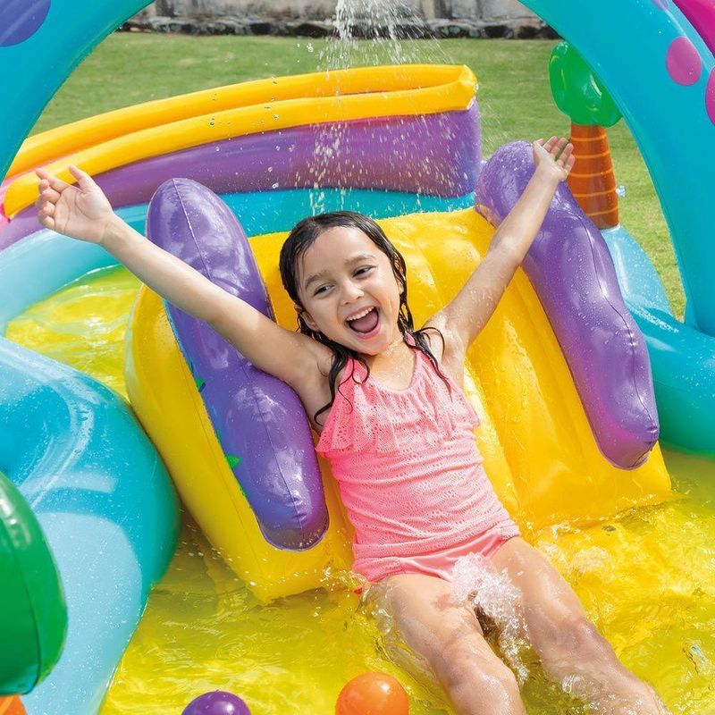 Piscina Playcenter Infantil Floresta 280 Litros IntexA Piscina Playcenter Dinolandia além de ser confeccionada com materiais de alta qualidade, conta com diversas opções de atividades para as crianças, tais como, piscina, escorregador, jogo de bolinhas(6 bolinhas de plástico inclusas). Além disso, possui um Dinossauro artificial que esguicha água além de uma superfície super confortável. Diversão garantida!Características:Dobras de fácil armazenamentoInfla rapidamente e facilmenteSolo reforçado para maior durabilidadeVários brinquedos em 1Dimensões : 332 cm x 229 cm x 112 cmMateriais: Seguro e durável.Capacidade de peso: 80KGCapacidade:280 LitrosPara crianças de 3 a 9 anosAdesivo de reparosPiscina Playcenter Infantil Floresta 280 Litros Intex