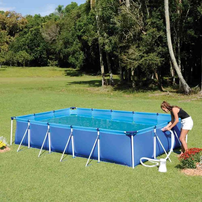 Piscina Retangular 10000 Litros Estruturada Premium Mor Pensando em uma diversão que não seja interrompida em nenhum momento, a Piscina Premium 10.000 litros foi desenvolvida em estrutura com tubos de aço totalmente firmes e de forte aderência à impactos. Sua lona em PVC monocromático oferece total suporte e possui tripla camada: duas lâminas de PVC com uma trama de poliéster entre elas, perfeita para dar mais resistência ao produto. Possui ainda válvula para encaixe de filtro e deságue de água, tornando muito mais fácil seu processo de montagem e manutenção. Seus exclusivos esquineiros na cor verde-maçã garantem mais firmeza, facilidade ao montar e também um melhor acabamento. As escoras da Piscina são pintadas em epóxi à pó na cor branca, garantindo ainda mais durabilidade, além do design moderno e inovador. Tudo para proporcionar mais praticidade durante sua manutenção, deixando a hora do lazer muito mais tranquila e divertida. Perfeita para a família toda se reunir e brincar de montão na melhor época do ano! Atenção! Nunca deixe crianças sozinhas perto da água sem supervisão de um adulto. Descrição do produtoMarca: MorMaterial: PVCFormato: RetangularCor: AzulCapacidade: 10.000 LitrosMedida da piscina com escoras: 5,26m x 3,54m x 84cmAltura: 84,00 CentímetrosLargura: 2,70 MetrosComprimento: 4,42 MetrosPeso: 40,04 Kilogramas Imagens meramente ilustrativas, todos os itens que ambientam o produto não estão inclusos.