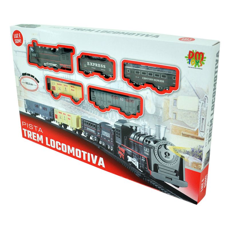 Pista oval com Trem Locomotiva com luz e som. Fácil de montar. Conteúdo da embalagem: 1 locomotiva, 3 vagões e 12 trilhos. Com luz e som, montagem fácil, diâmetro da pista: 85,5 cm, utiliza 02 pilhas AA não incluídas. Ficha Técnica: Fornecedor: DM TOYS Referencia: DMT5750 Idade Recomendada; + 3 ANOS Embalagem: 47 x 30 x 04 Cm Código de Barras: 7899205957508 Composição: Plástico PP Produto Certificado Inmetro OCP 0019, REGISTRO N: 003 954/2022 Garantia: Contra Defeitos de Fabricação Todas as informações divulgadas são de responsabilidade do fabricante/fornecedor. Imagens Meramente Ilustrativas. Observe atentamente a idade recomendada para o brinquedo. Pode conter partes pequenas que podem ser engolidas e perigosas A Jéssica Presentes está no mercado a mais de 20 anos, com a missão de proporcionar um ótimo atendimento aos seus clientes, sempre em busca de novidades na área de brinquedos e papelaria.